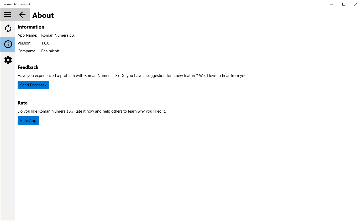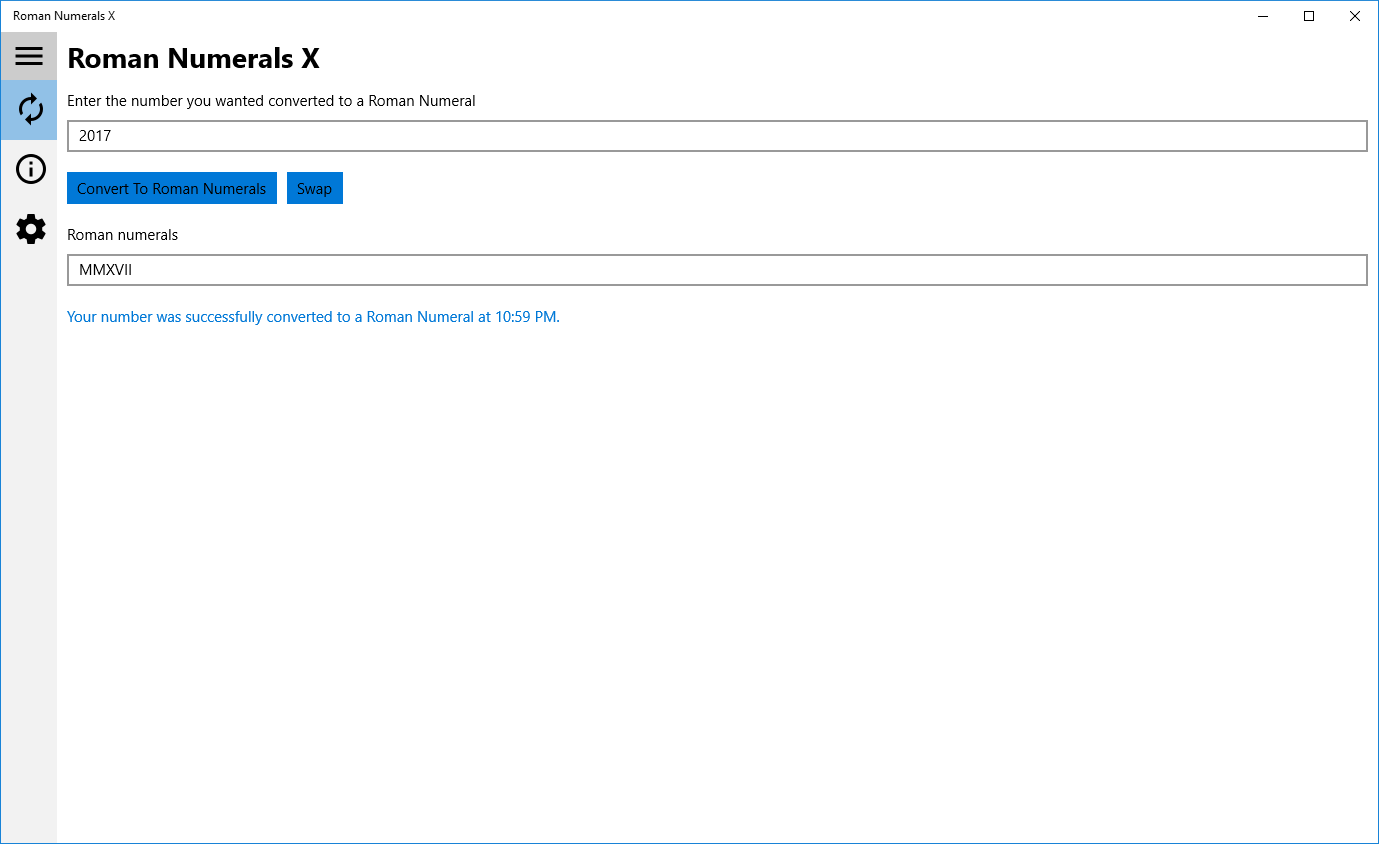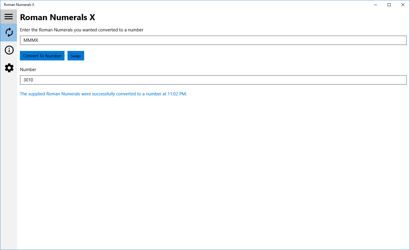 Use this app to convert numbers into Roman Numerals, or Roman Numerals into numbers. This app is free and works on all Windows 10 devices. You can paste in a value to be converted, and then copy the results out.