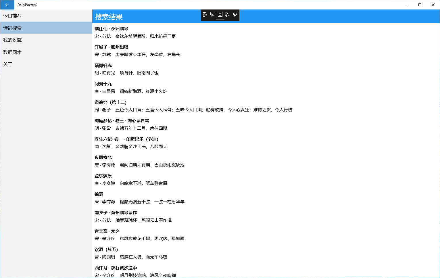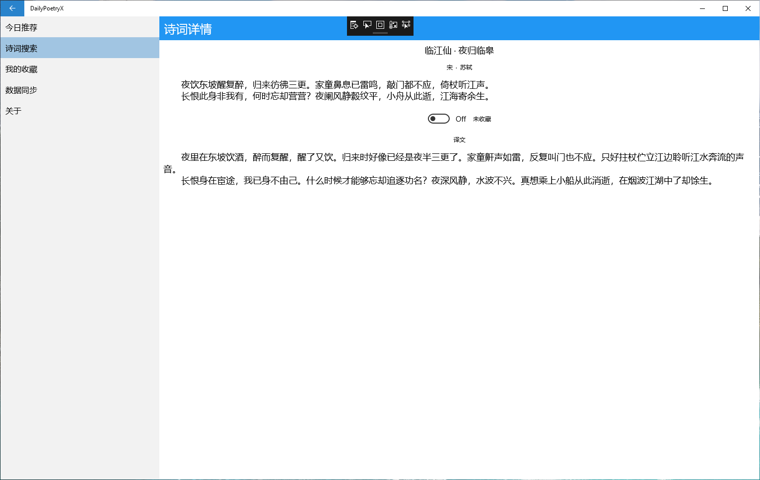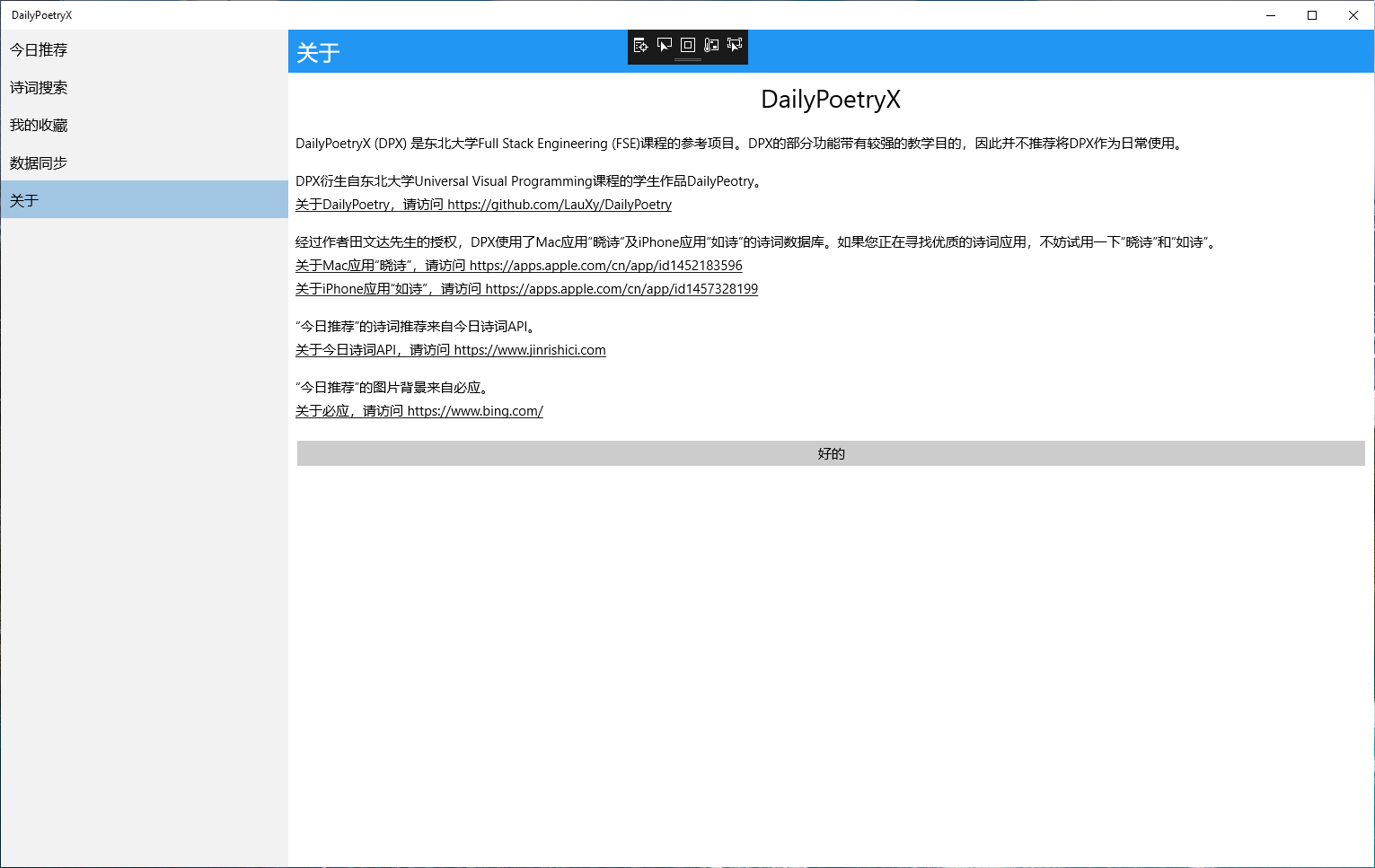DPX衍生自东北大学Universal Visual Programming课程的学生作品DailyPeotry。DPX具备每日诗词推荐、诗词搜索、收藏、OneDrive收藏同步等功能。