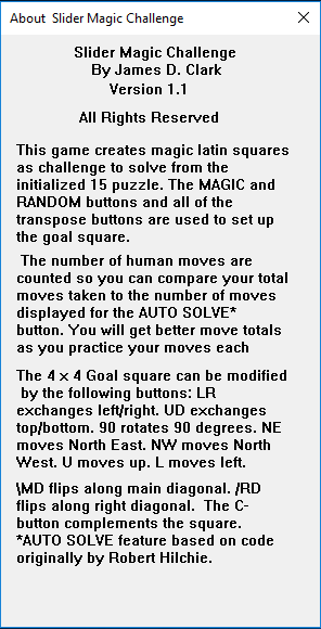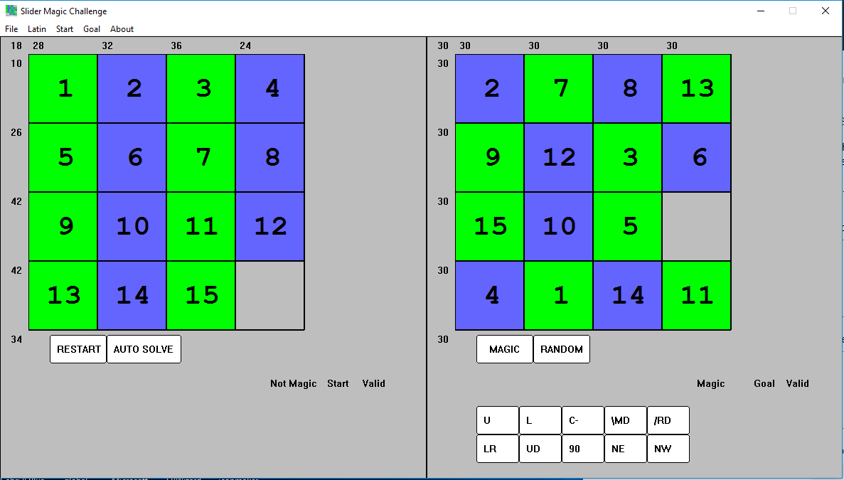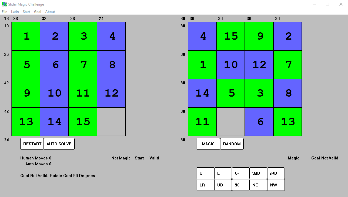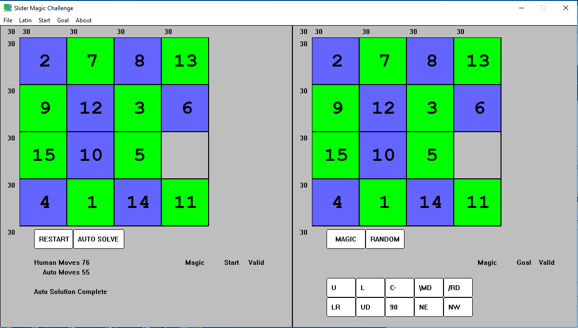 This game creates magic latin squares as challenge to solve from the initialized 15 puzzle. The MAGIC and RANDOM buttons and all of the transpose buttons are used to set up the goal square. The number of human moves are counted so you can compare your total moves taken to the number of moves displayed for the AUTO SOLVE button. You will get better move totals as you practice your moves each game.
