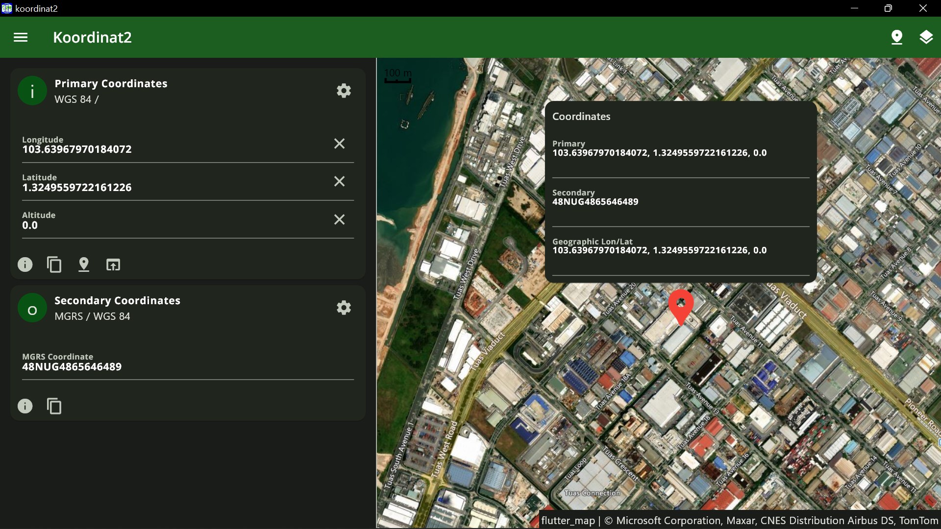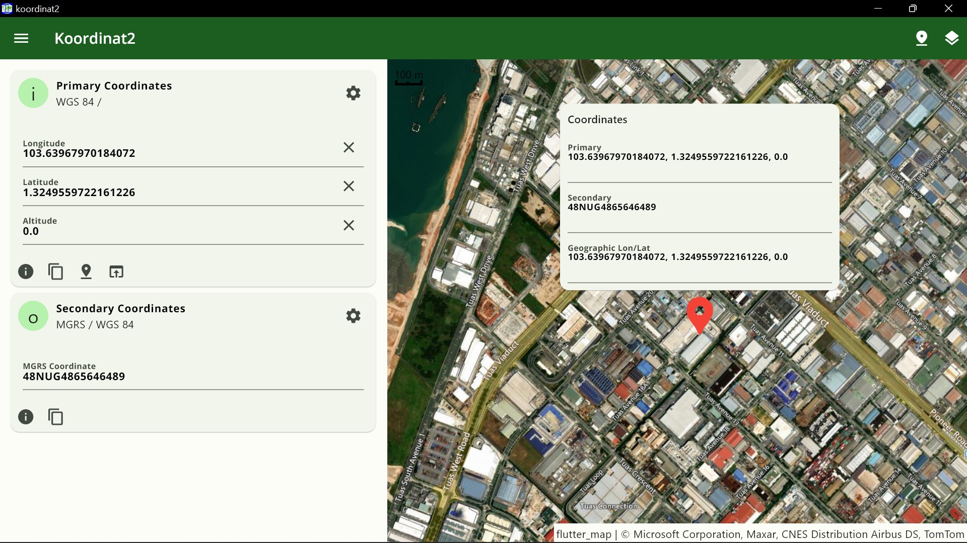 Display converted points on base mapsSupport for ECEF, MGRS, NED, ENU, and many other coordinate systemsInteractive, reactive and responsive interfaceLight and dark themesSave frequently used coordinate systems as favorites for easy selectionChoice of OpenStreetMaps, Bing Maps, and Singapore OneMap map base layers to use