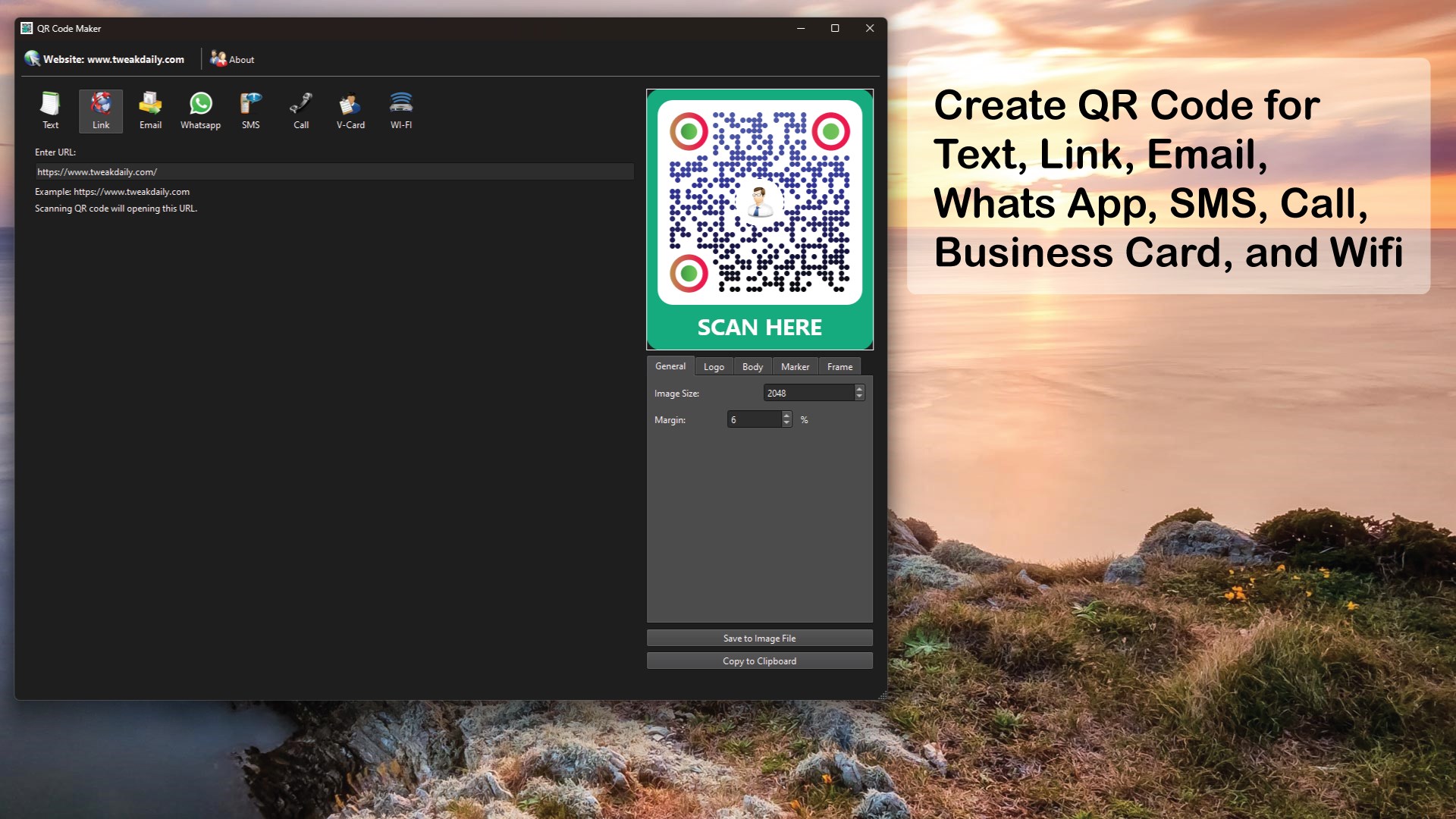 Generate QR Code for text, link, email, Whatsapp, SMS, Call, and Wifi.Export QR Code to PNG image format.