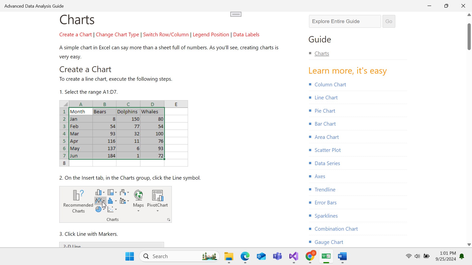 4 Charts: Column Chart | Line Chart | Pie Chart | Bar Chart | Area Chart | Scatter Plot | Data Series | Axes | Trendline | Error Bars | Sparklines | Combination Chart | Gauge Chart | Thermometer Chart | Gantt Chart | Pareto Chart