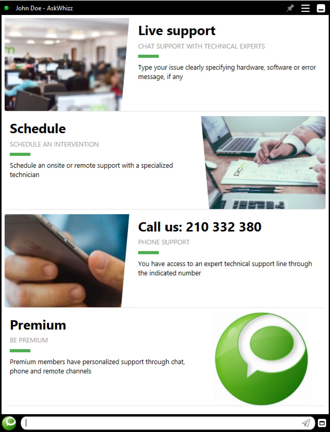 Just type in you issue or question and within seconds a technical expert will be available to help. Also, he will be assigned to you as your personal agent, accompanying continuously your day-to-day IT needs, solving any problems and helping you know in making the best use of your equipment.