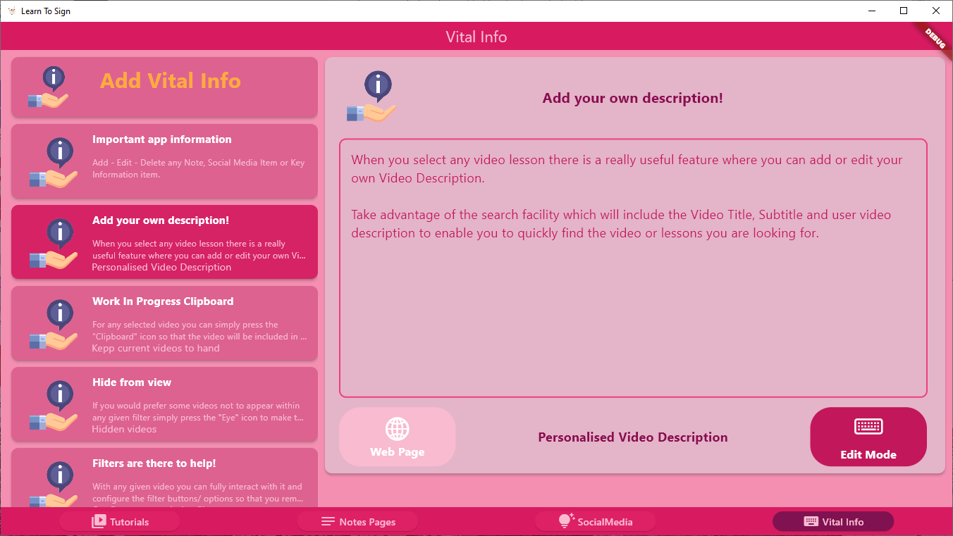 Over 200 Interactive Video Tutorial Guides on Learning How To Use Sign Language, with many user interactive features to make your learning experience as easy and as fun as possible.Each Tutorial is fun and easy to follow.App has a wealth of user interactive features to help you learn in the quickest time possible.Fully Customise and Maintain your own set of user notes within the self contained module Add and maintain your one touch Social Media Links to your favourite sites or user groupsKeep a customised set of \'Key Information\' details in the dedicated module so tou keep track of any vital info!All modules are there to help your learning experience all without the need to leave the app!Everything you need to learn as quickly as possible is included within the app