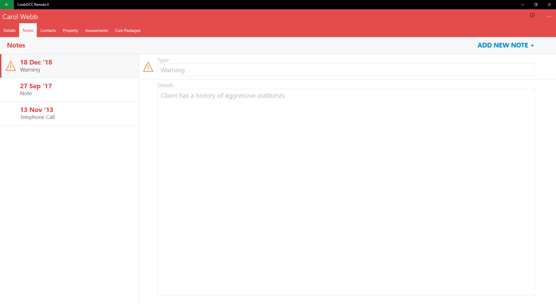 Any notes and warnings can be viewed and the user can create new notes and warnings during the visit.