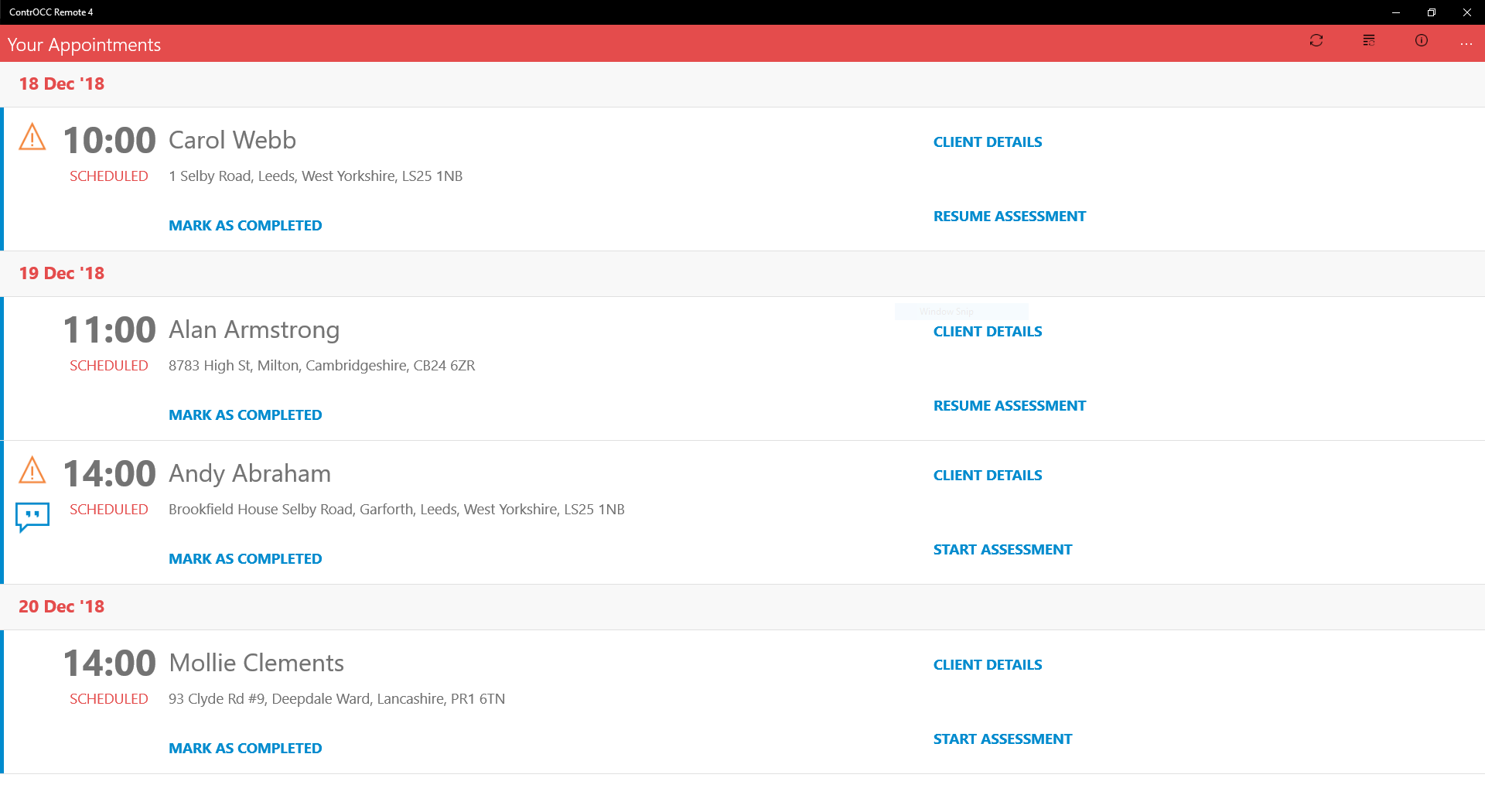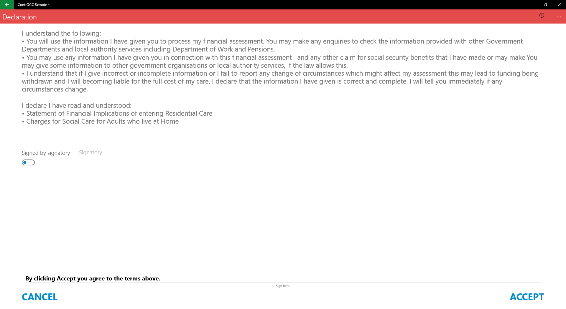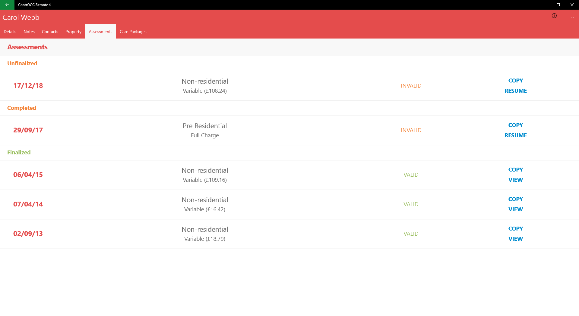 Fully integrated with ContrOCC. Appointments and service user details are downloaded to the tablet. Assessments are entered using the rules and details that the council has configured in ContrOCC. The resulting assessment and any evidence captured during the visit are uploaded to ContrOCC to calculate charges and payments.