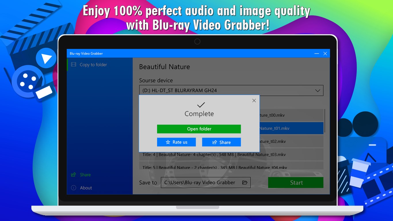 Get 100% perfect audio and image quality! Install Blu-ray Video Grabber!