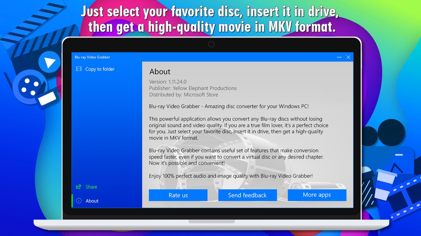 Conveniently-fast conversion from any Blu-ray discs to MKV format.Option to select any desired output folder for converted video files.Smooth ripping process regardless of disc\'s size or quality.Selection of titles from the disc to convert them in a queue.Superb alternative for working even with virtual discs.Support for any Blu-ray drives on your PC.