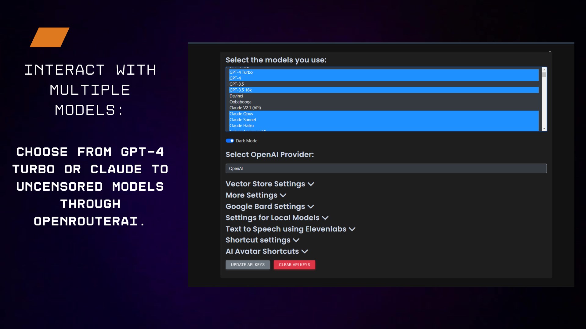 Drag, Drop, and Go: Forget copy-pasting! Directly upload your documents and interact with them using the power of AI. Analyze PDFs with Langchain and Vector Database integration.Voice Commands: Speak your instructions with Whisper AI integration and watch the app execute them flawlessly. The future is here!Multiple AI Models: Choose from a diverse range including GPT-4 Turbo, Claude, Cohere, and more. Experiment and find the perfect fit for your needs. Custom Instructions: Tailor GPT\'s responses to your specific requirements with personalized instructions. Switch between them seamlessly for ultimate control.Output Control: Edit, refine, and manage your AI-generated content effortlessly. Generate new files directly from code markdown responsesDALL-E 3 Integration: Unleash your creativity and generate stunning images, individually or in batches.Vision Model: Explore the power of visual understanding with cutting-edge vision models.Task Automation: Streamline complex workflows with chains and multi-step processes.Dark Mode: Enjoy a sleek and comfortable interface.Google Search with APIFY: Effortlessly research within the app. Constant Updates: Benefit from continuous improvements and new features like AI agents and local model experimentation with Oobabooga.Your API Keys are Safe: We never store your API keys.
