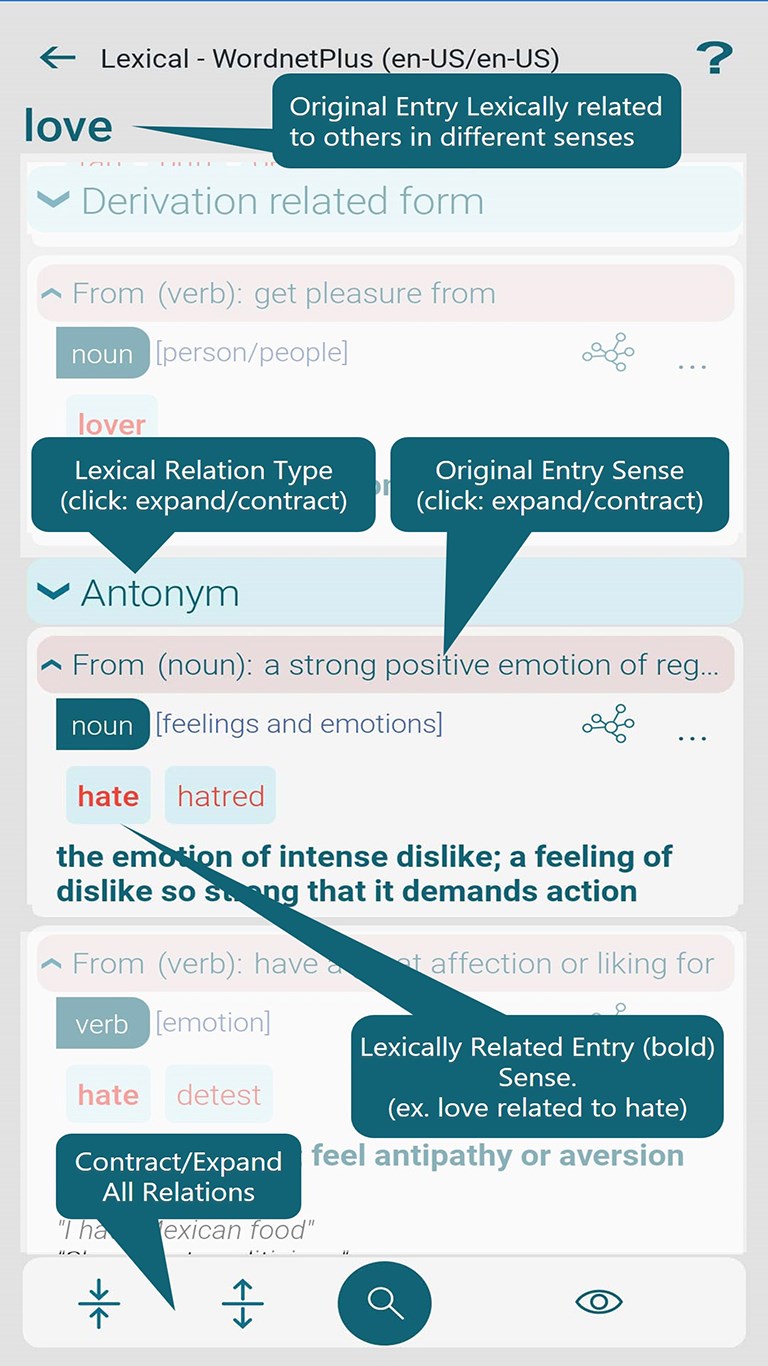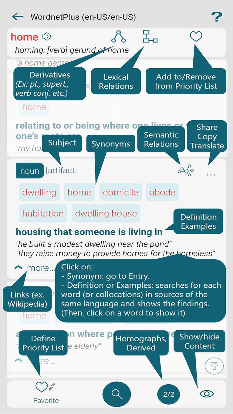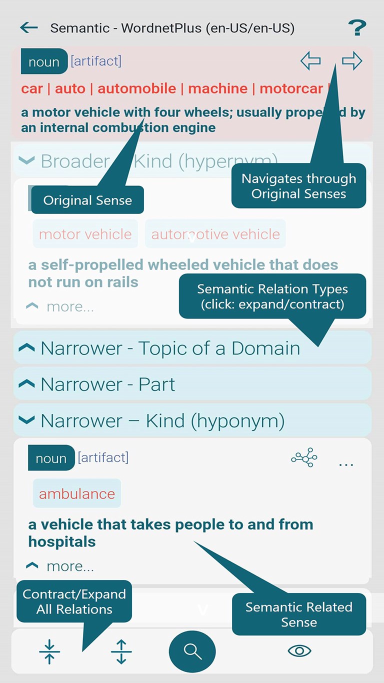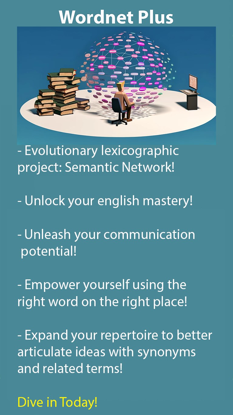 Wordnetplus is an encyclopedic dictionary that helps build English vocabulary skills and, at the same time, is a powerful instrument of knowledge acquisition, with its unique features bundled to ease the mental process of memorizing new words.