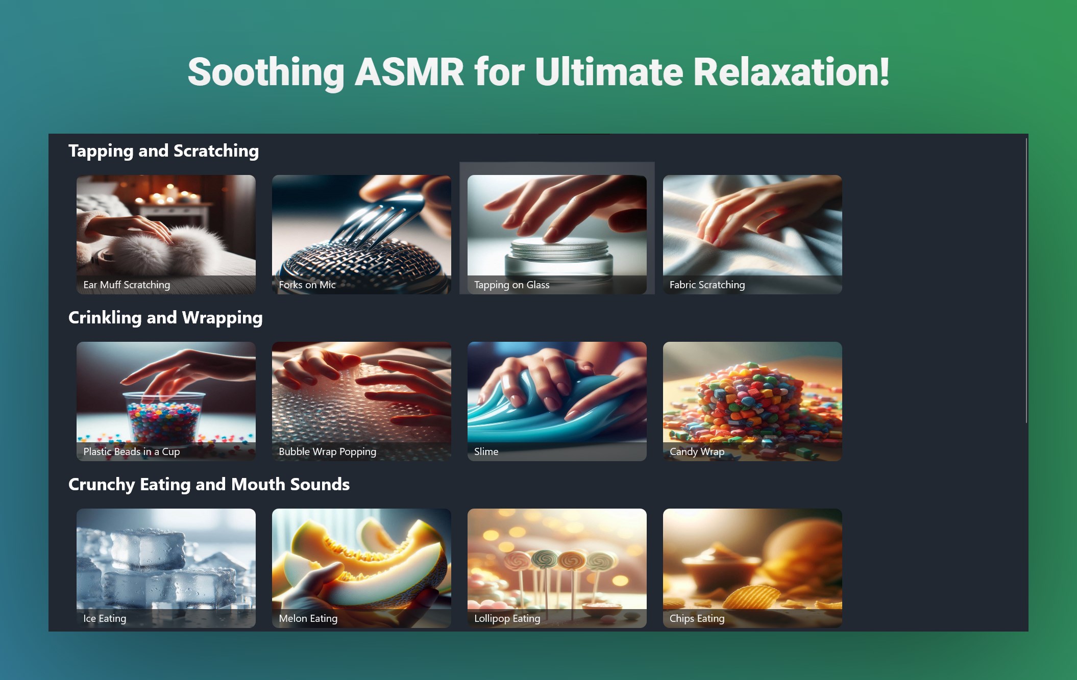 Relax your mind and body with ASMR Sounds, the ultimate app for tingles, relaxation, stress relief, and deep sleep. Experience a wide variety of high-quality binaural and 3D ASMR triggers, including tapping, whispering, crinkling, scratching, brushing, and water sounds.