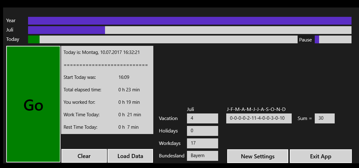Die GleitzeitApp berechnet und visualisiert auf Basis der regelmaessigen woechentlichen Arbeitszeit, sowie der Urlaubstage und bundesland-spezifischen Feiertage die tägliche, monatliche und im aktuellen Jahr geleistete Arbeitszeit