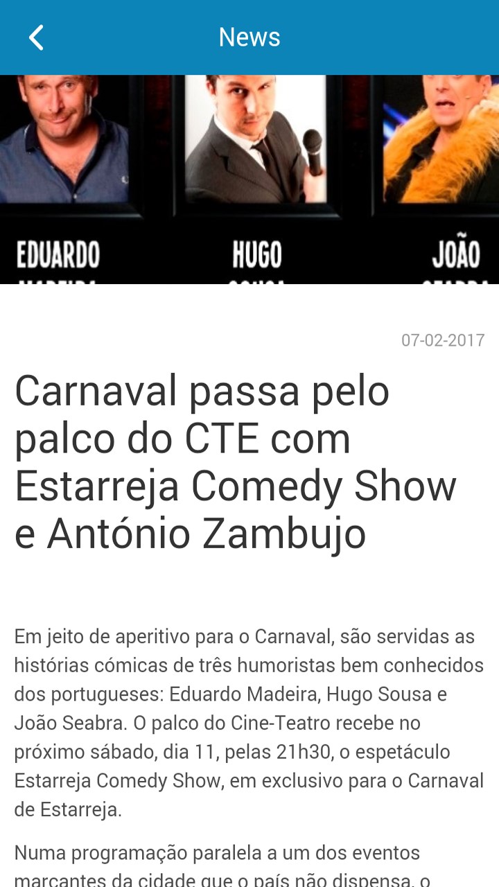 Application that aims to promote news and events, spread of information and tourist and cultural promotion of the municipality of Estarreja. The group of features will soon be available and the municipality will be able to communicate and receive direct feedback from the citizens, by providing some services.