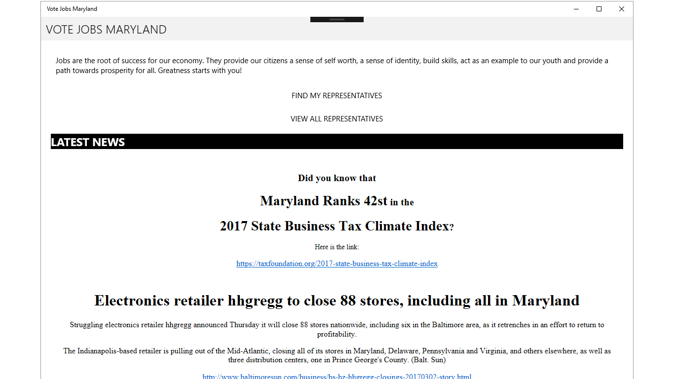 This application provides you the latest news on creating jobs in Maryland as well as voting records for Maryland Senate and House representatives for legislative bills and their performance.