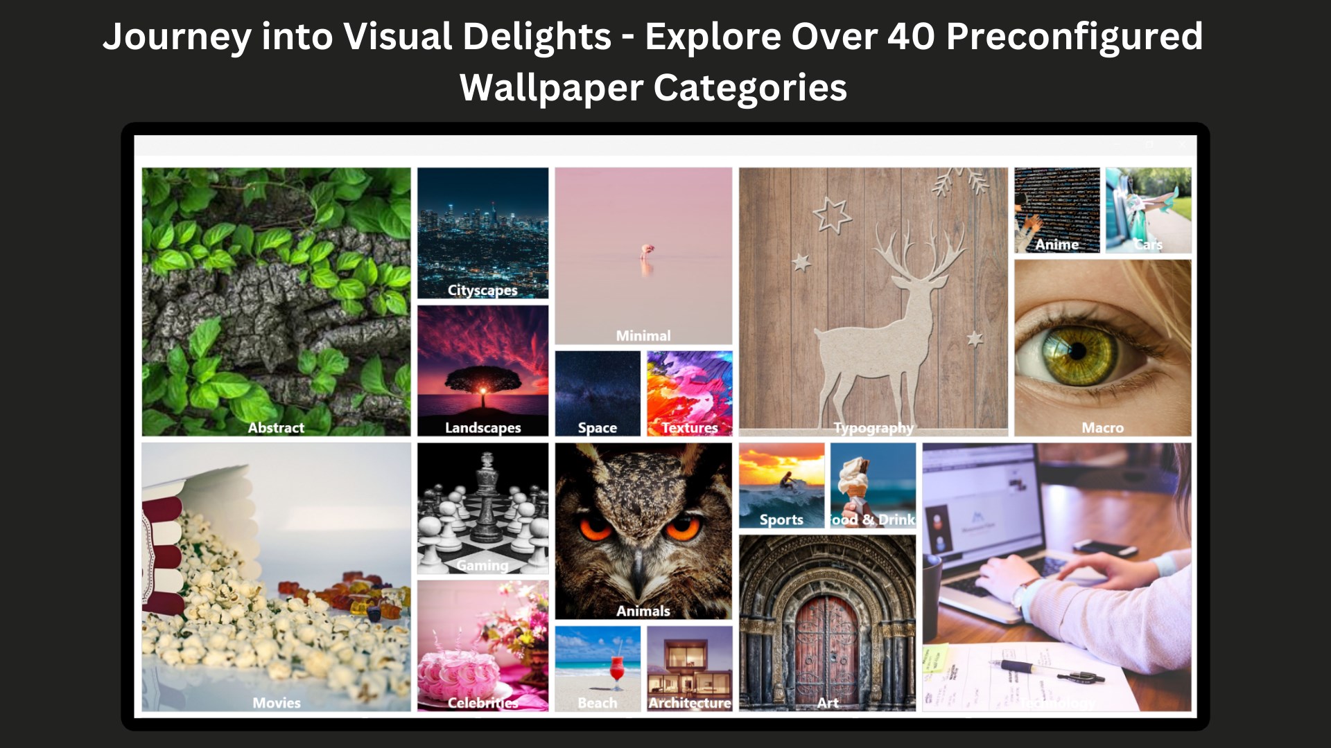 Open the 4K Wallpapers app and start exploring our extensive gallery of high-resolution wallpapers. You can easily navigate through our more than 40 preconfigured categories to find your perfect fit. From soothing nature to fascinating abstract designs, there's something for every taste.