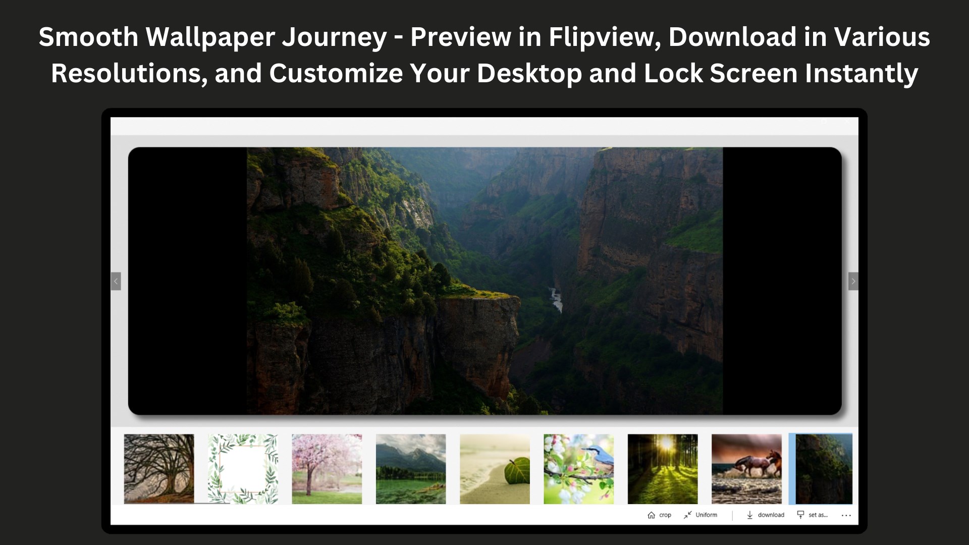 When you find an image or a video you like, click on it to preview. Experience the detail, vibrancy, and richness of 4K quality right on your screen. Flip through the wallpapers in a flip view to compare and choose your favorite one.