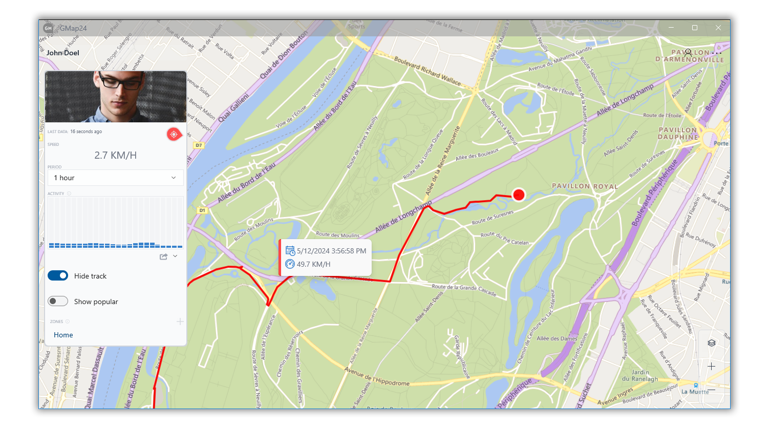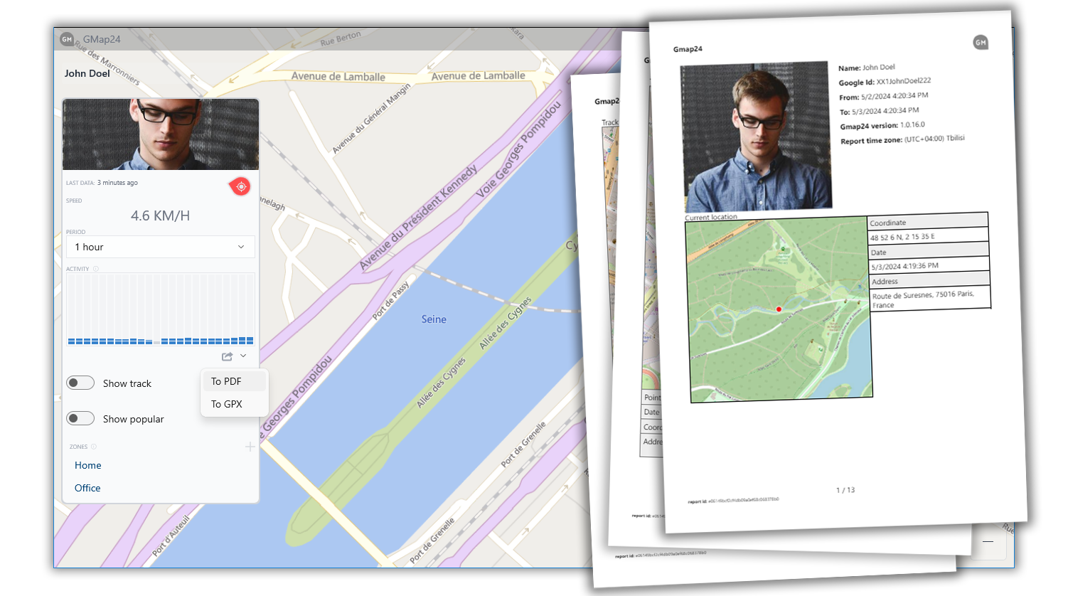 Securely store your data on your computer, enabling you to extract valuable insights and make informed decisions. With just a few clicks, you can seamlessly track multiple individuals, analyze specific time frames, view timelines, monitor real-time locations, track speed, and receive notifications for zone entries and exits. Discover the most visited places, view movement trajectories, and gain a deeper understanding of location data with Gmap24.