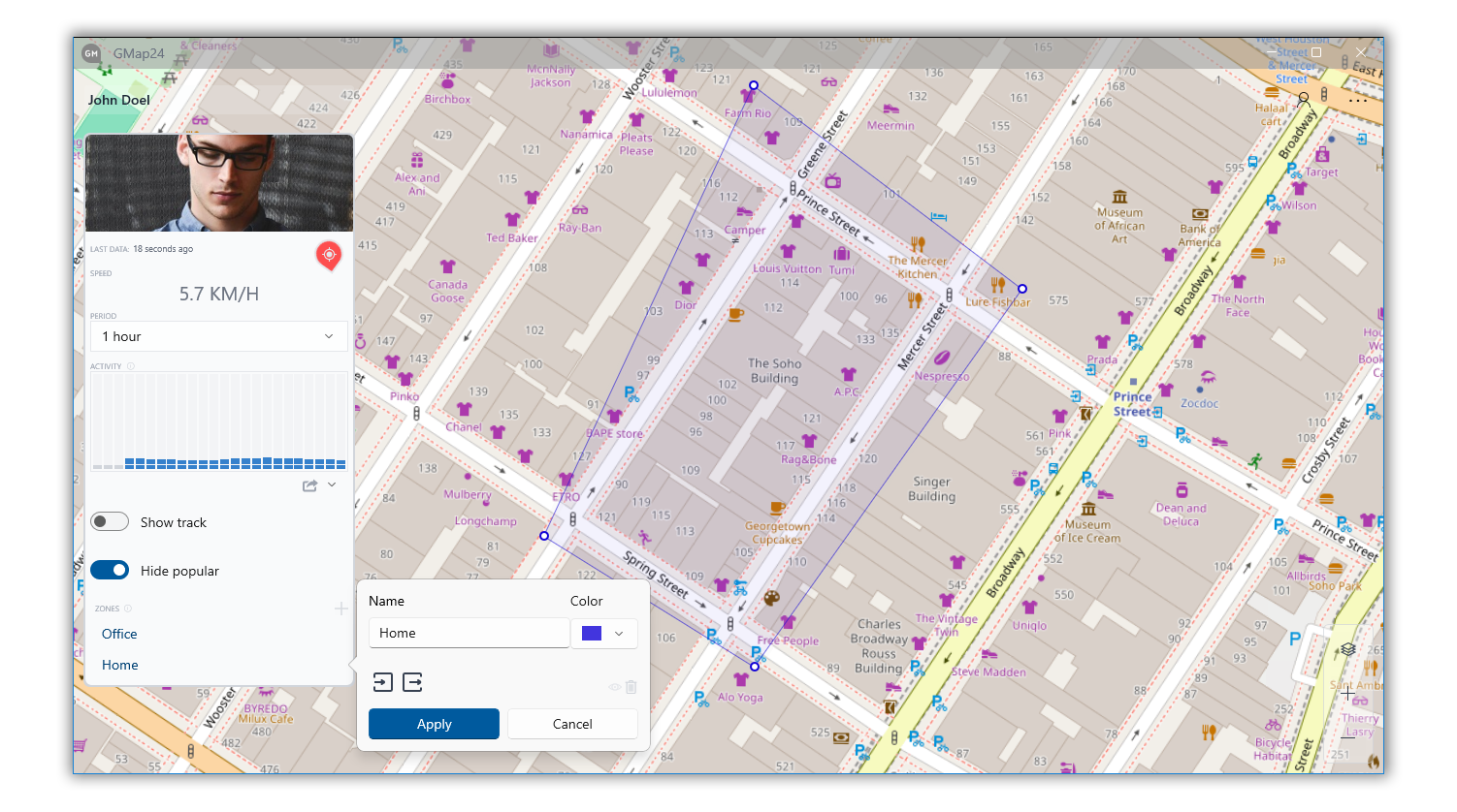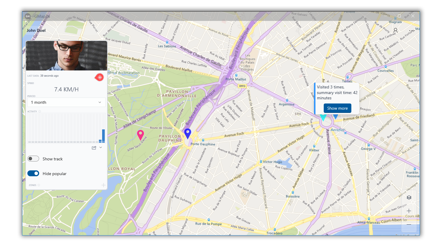 Watch the movement of several persons at the same time.Persona trajectory. In real time or over a time period, speed and time for each point.Most Frequently Visited Places. Location analysis: by day of the week, time intervals, heat map, etc.Control of visits to the selected zone. Create any number of zones for monitoring, set the desired shape of the zone on the map, receive notifications when an individual visits or leaves the zone.Export to PDF or GPX format. Generate a complete persona report in a print-ready format, or export accumulated data to a third-party device or application.Switch between different base maps as you work.