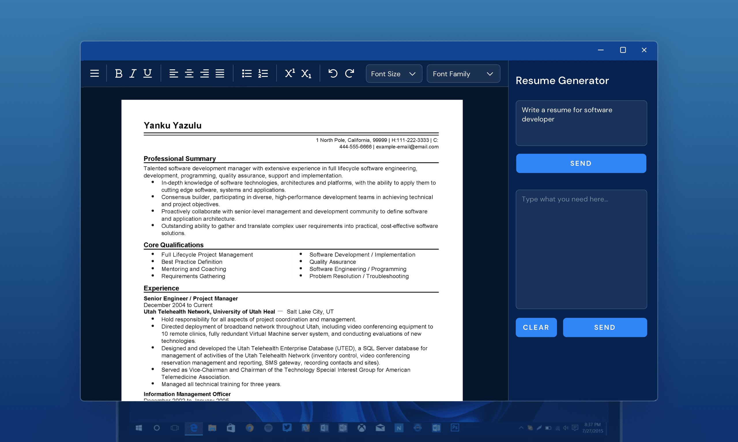 The power of AI to help you create a professional resume that is tailored to your skills and experience.The ability to add your own contentA spell checker and grammar checkerThe ability to download your resume in a variety of formats