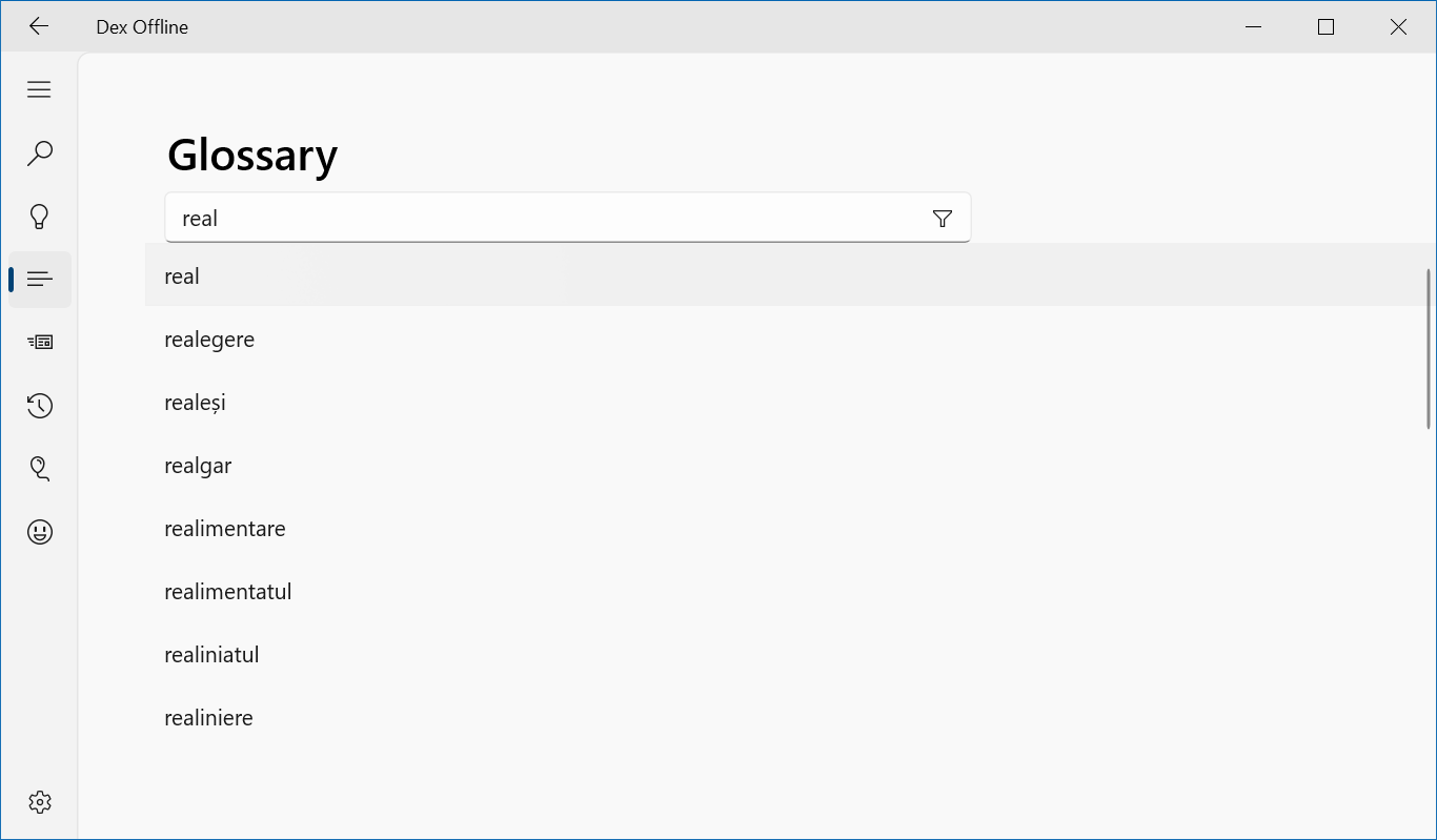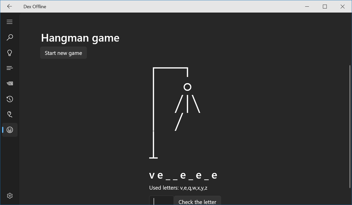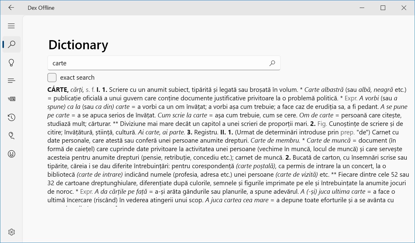 DexOffline is an application that helps you find words in offline and online DEX (the Romanian language dictionary), play Hangman, Pheasant or Wordle games and much more.