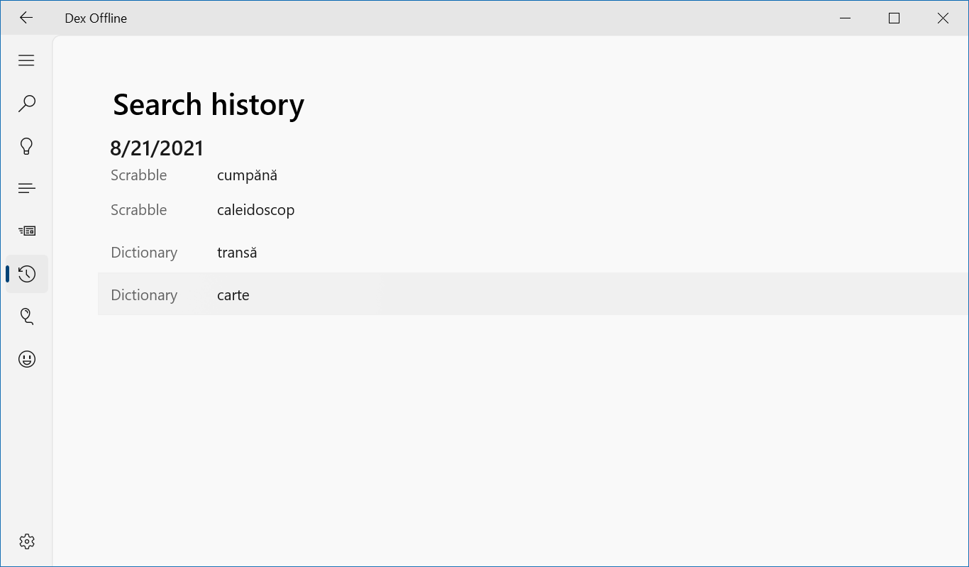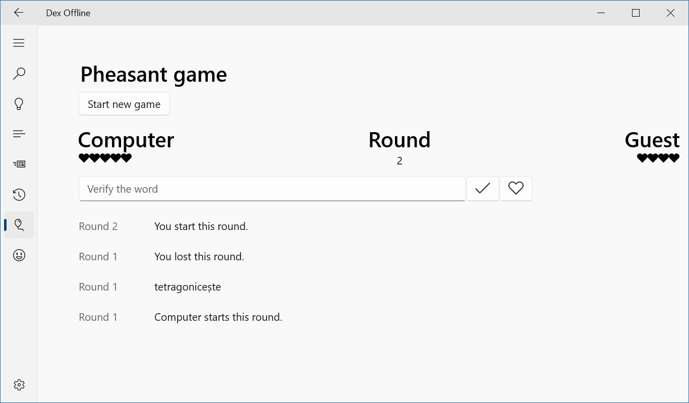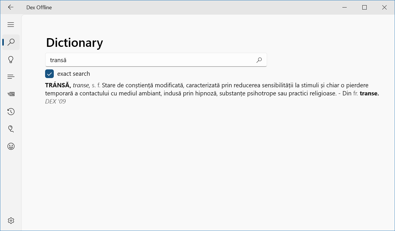 DexOffline is an application that helps you find words in offline and online DEX (the Romanian language dictionary), play Hangman, Pheasant or Wordle games and much more.