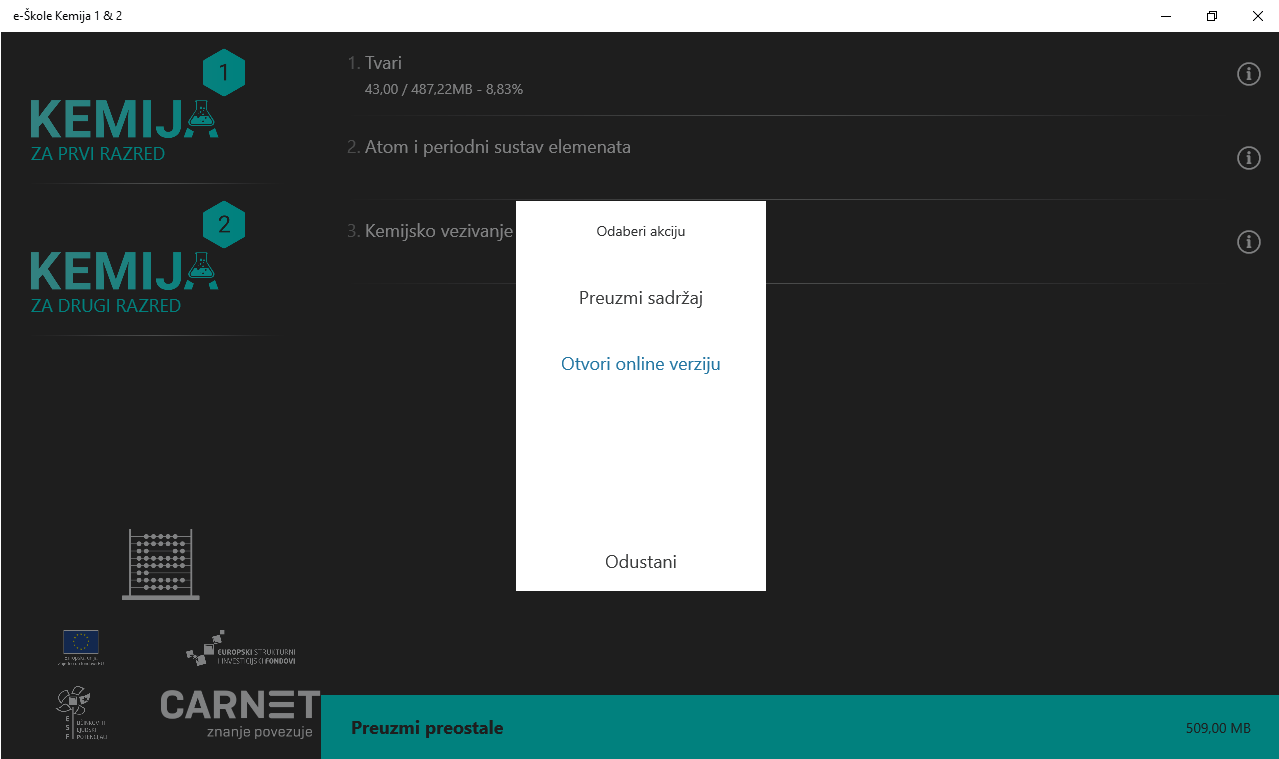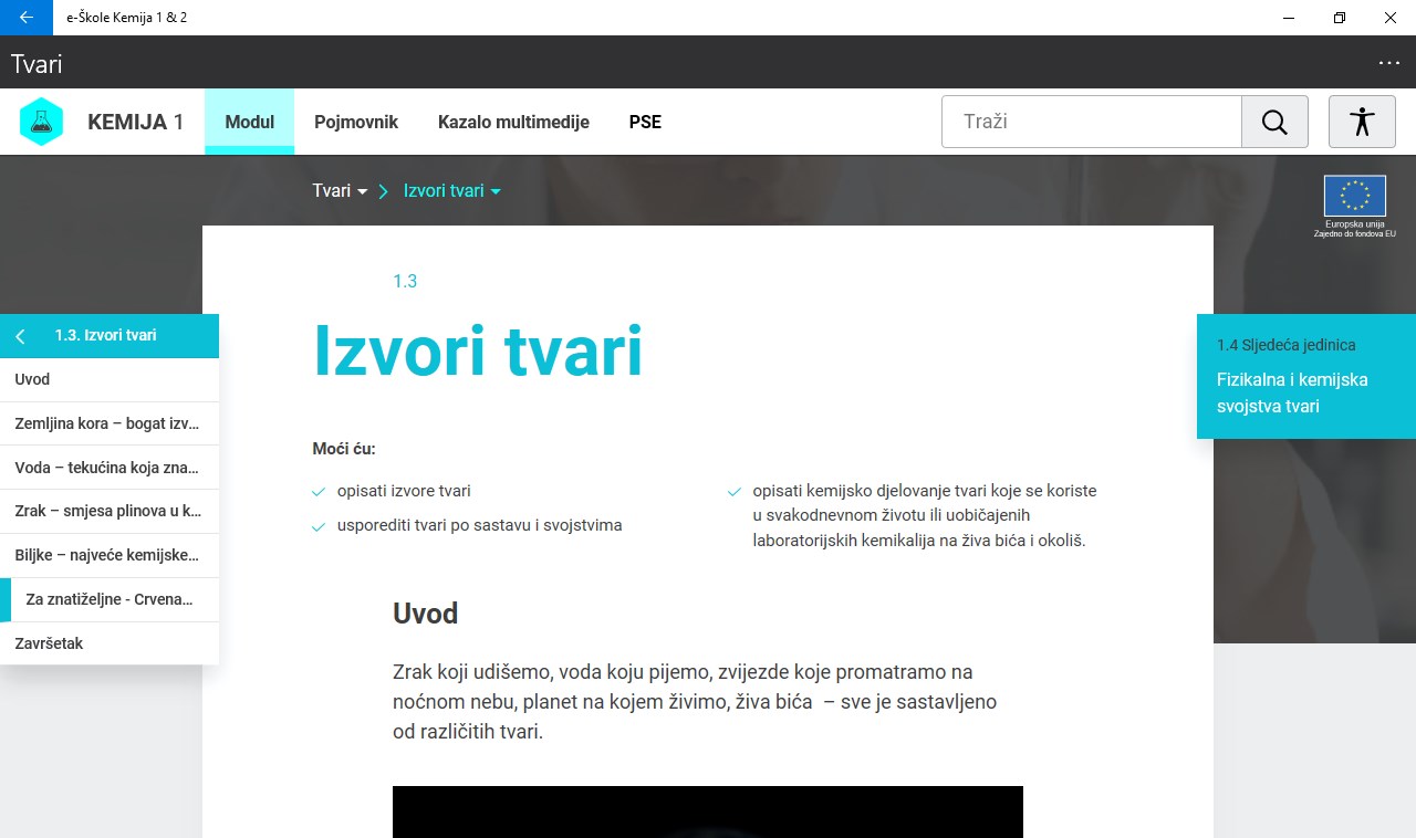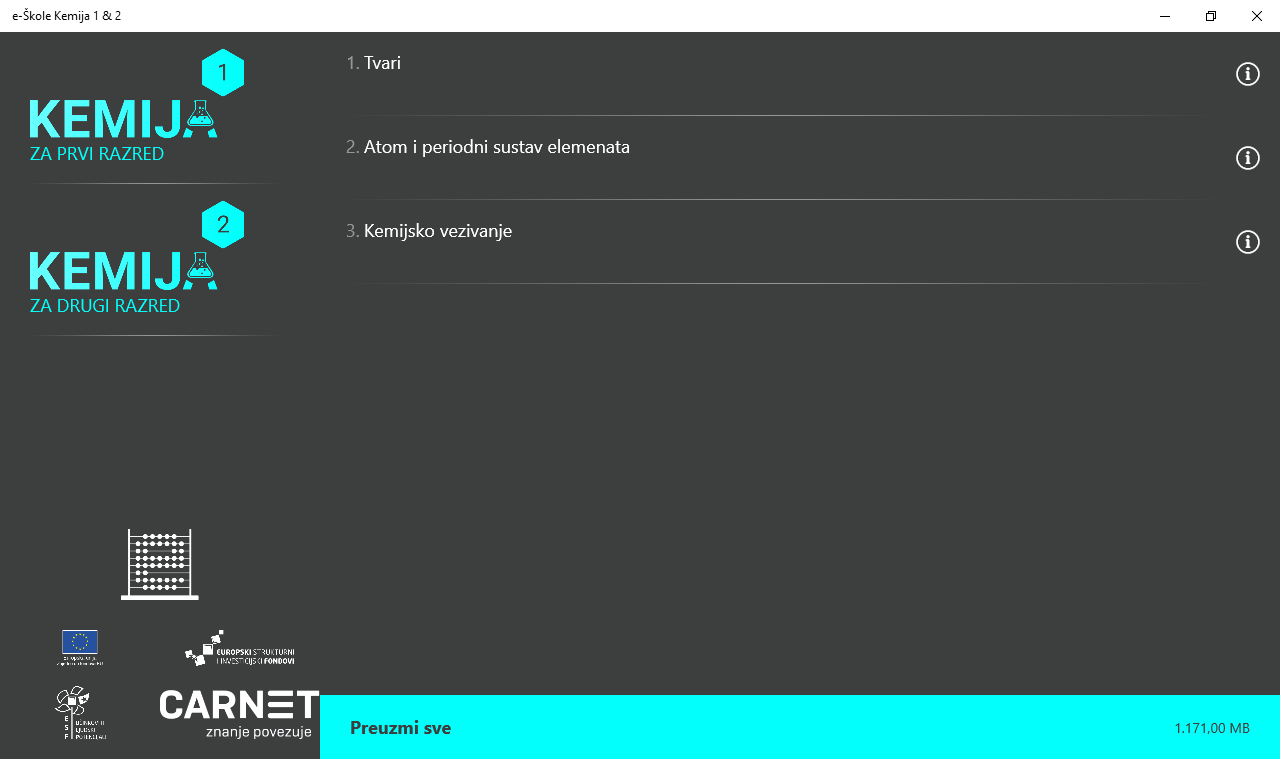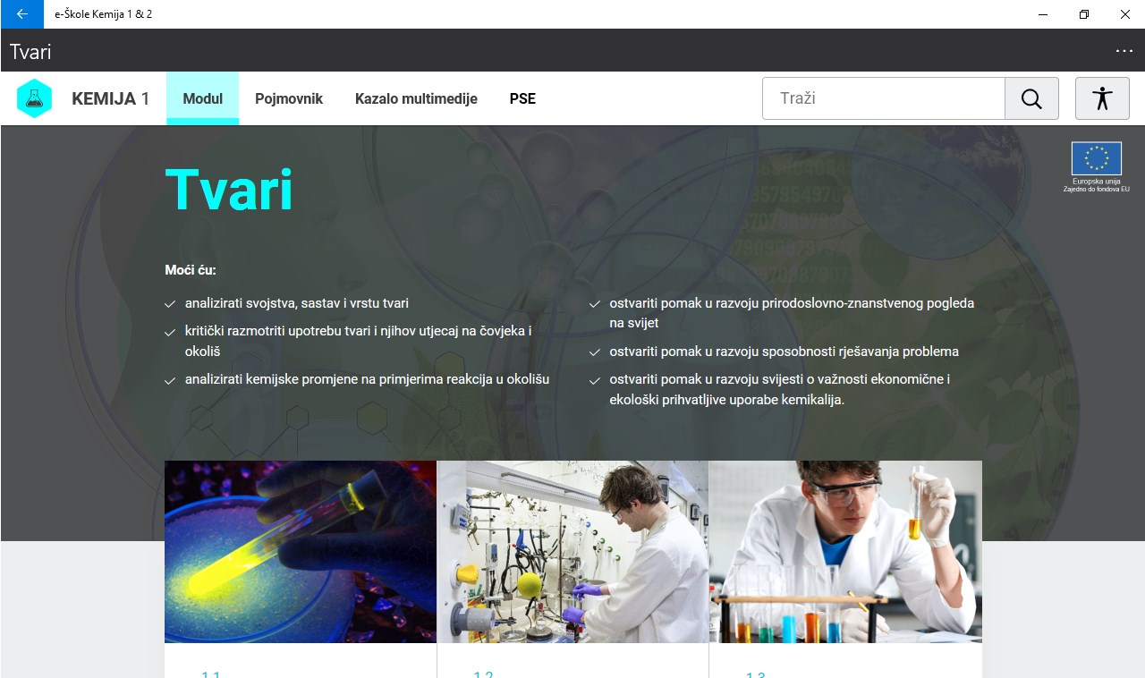 Kroz aplikaciju su dostupni digitalni obrazovni sadržaji za 1. i 2. razred srednje škole predmeta Kemija. Izrađeni su u obliku manjih cjelina (modula) koje se može zasebno koristiti, ali pokrivaju gradivo cijelog razreda. Sadrže tekstualne, audio, video, multimedijalne i interaktivne elemente, kvizove, pitalice, vježbe, simulacije i animacije, kao i eksperimente i problemske zadatke. Aplikacija omogućava korištenje sadržaja online, a za korištenje offline potrebno je u aplikaciji preuzeti pojedine module. Pri korištenju sadržaja moguće je podesiti postavke koje reguliraju kontrast, povećanje i prilagodbu vrste slova i elemenata. Ovi sadržaji i aplikacija izrađeni su u sklopu projekta "e-Škole: Uspostava sustava razvoja digitalno zrelih škola”.