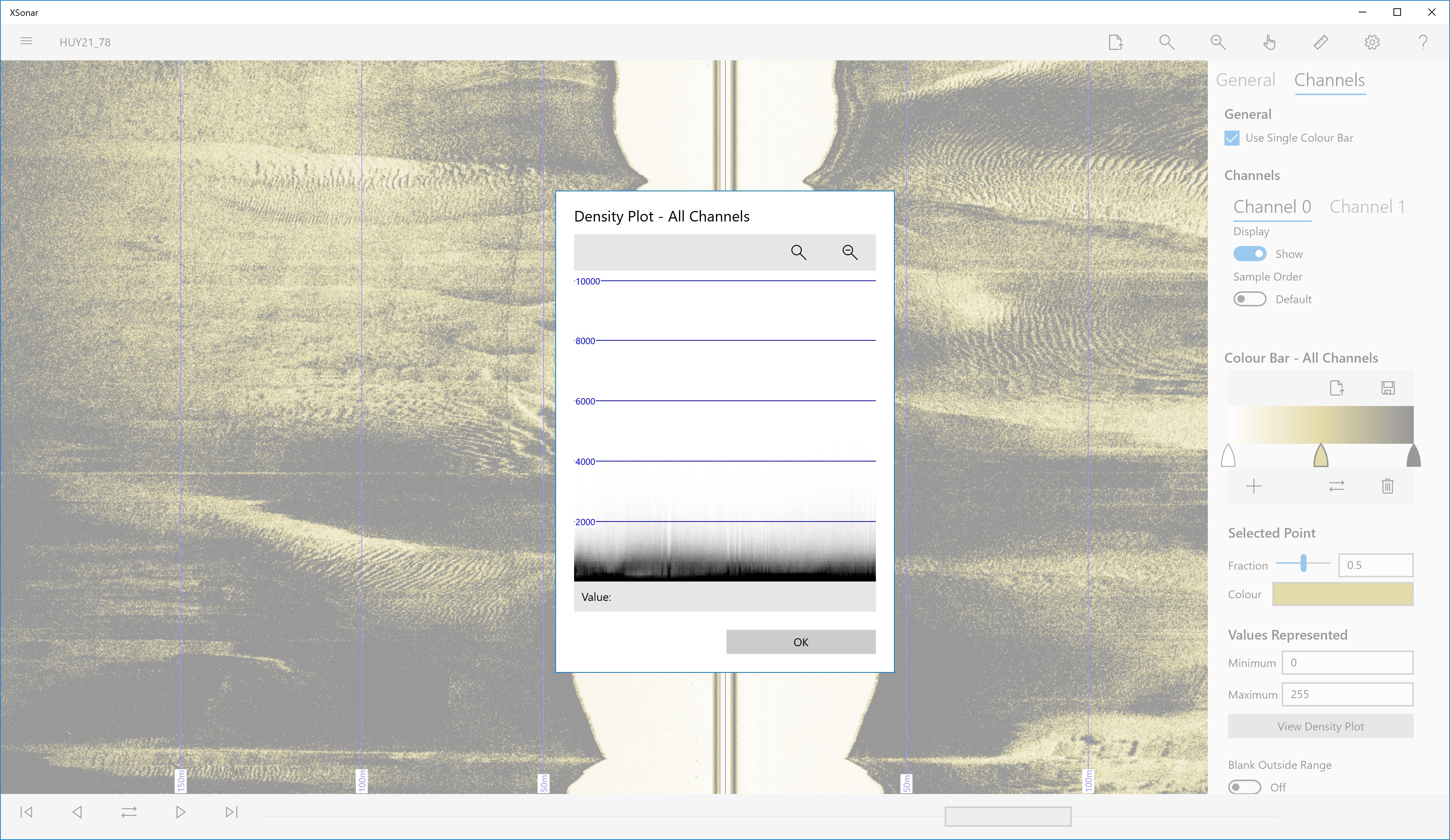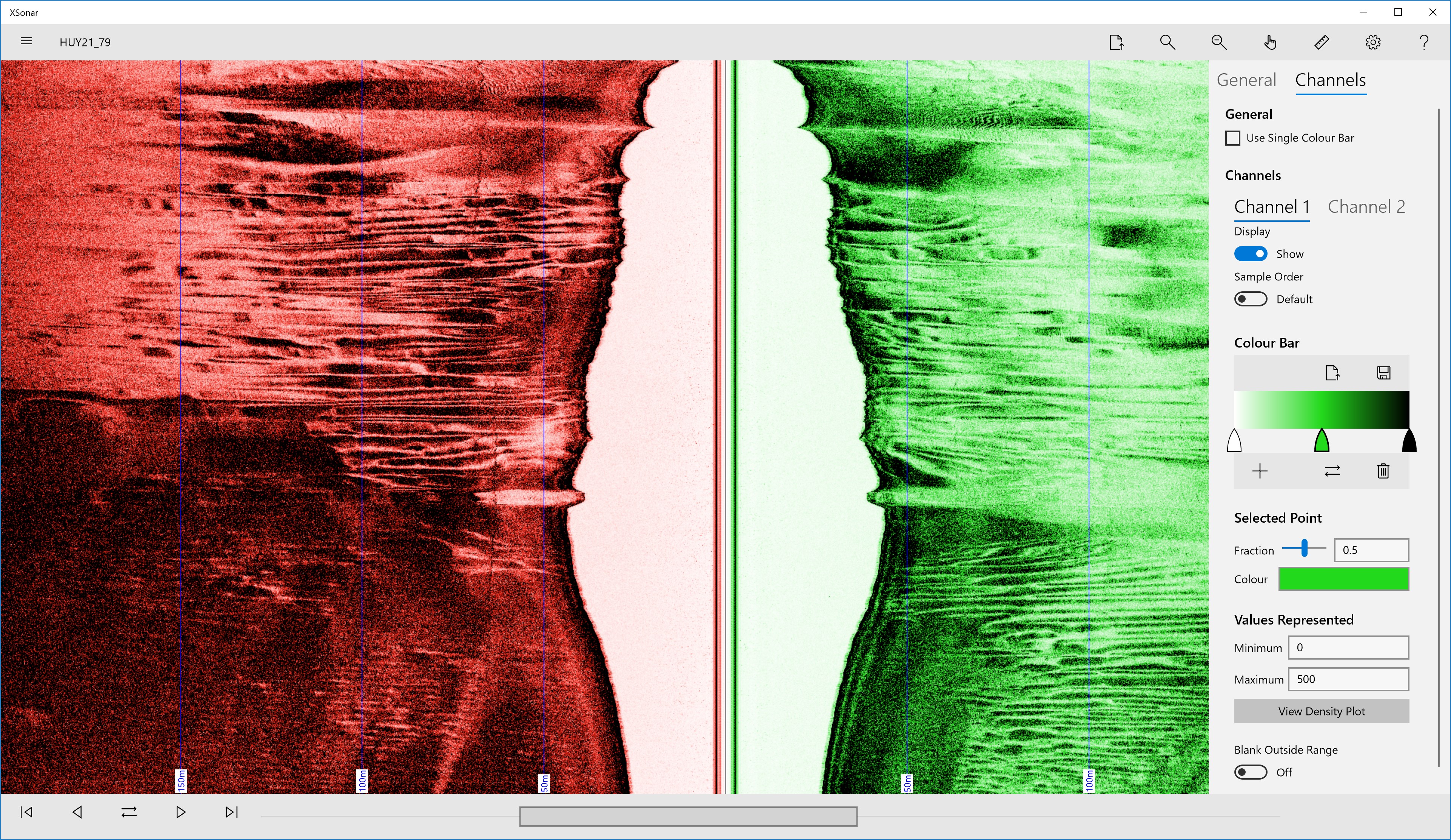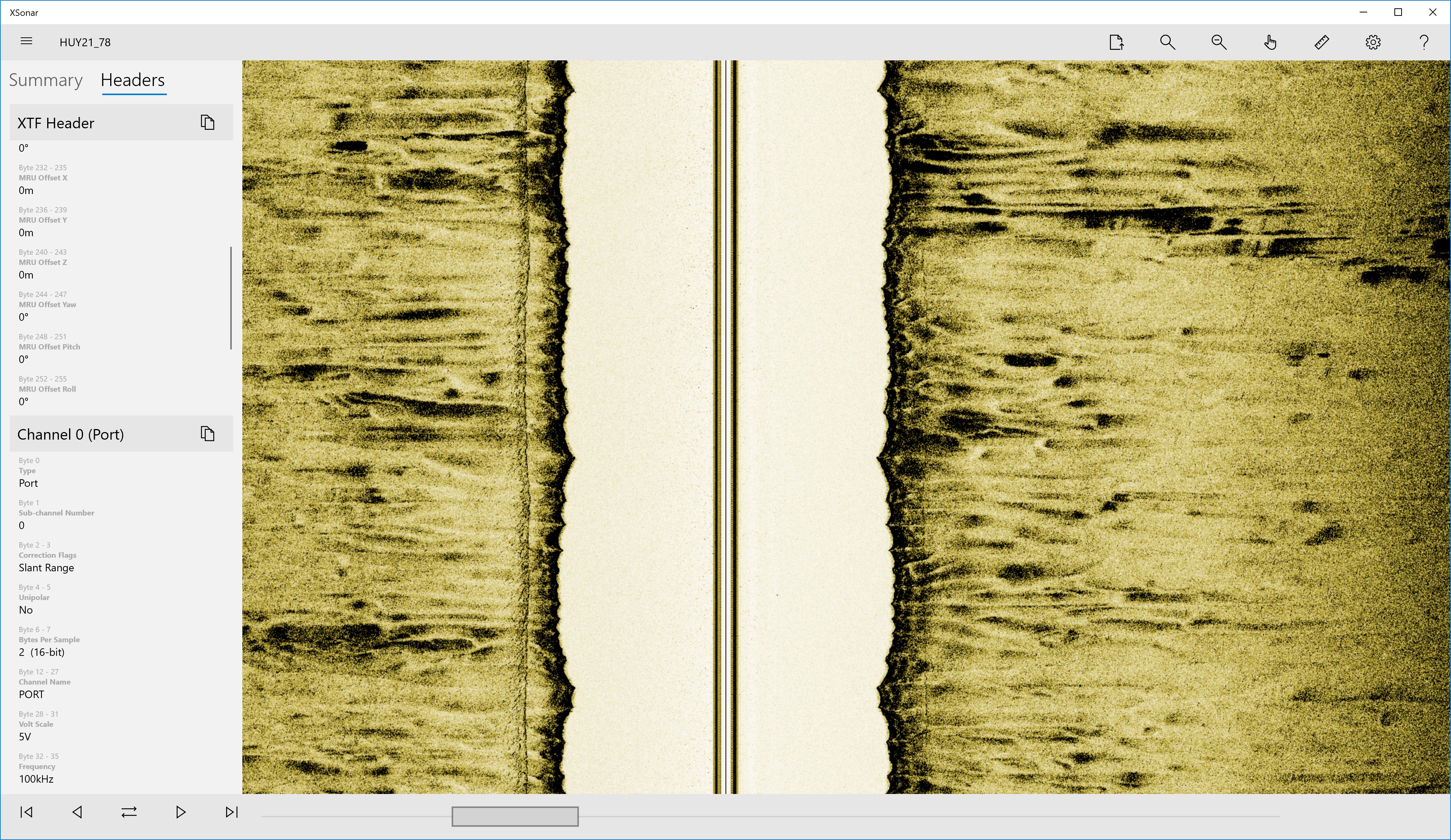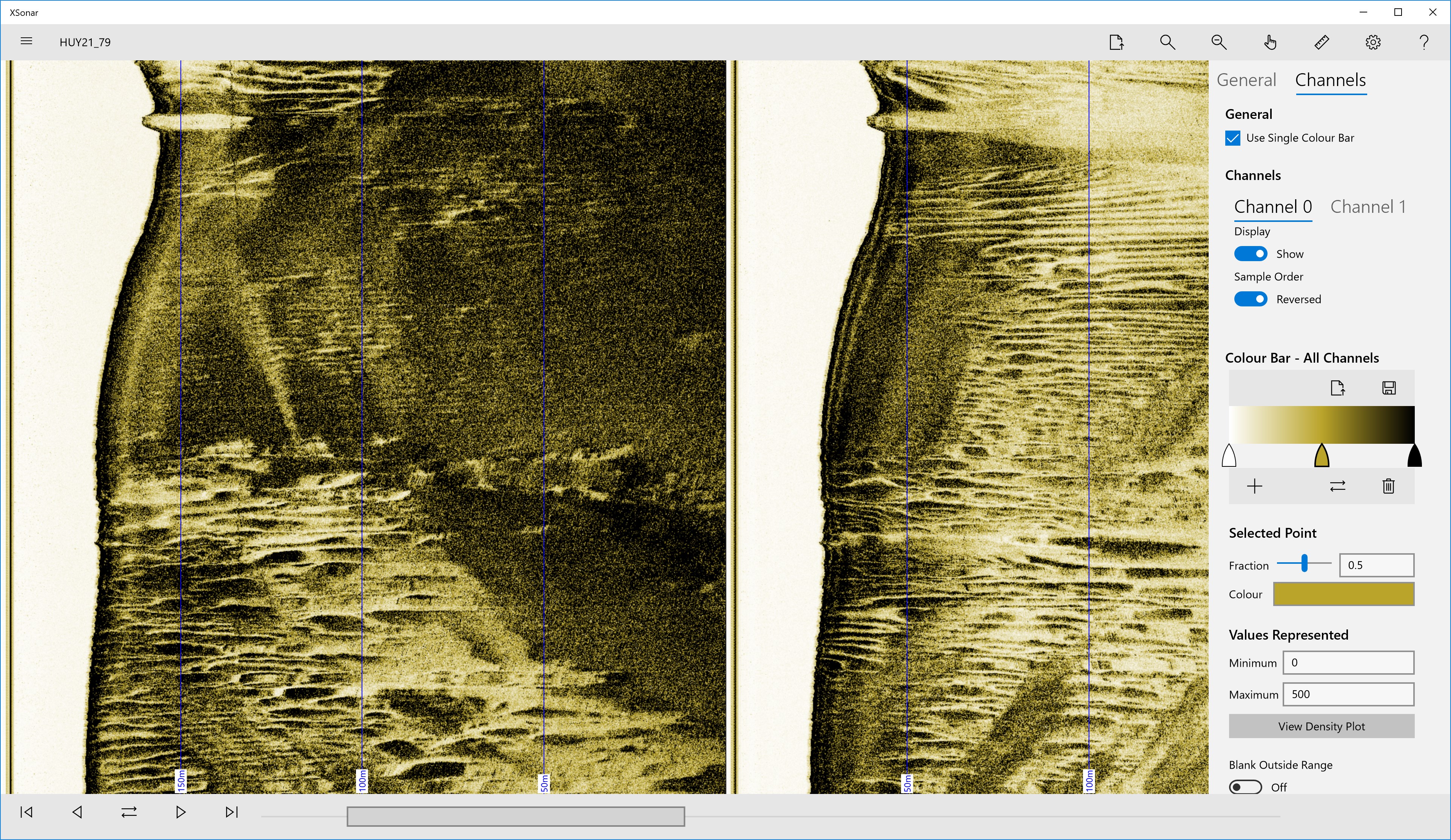 Open JSF and XTF filesView headers and summary information (start time, end time, number of pings) for each filePan, zoom and flip the dataAnnotate the data with fixes and range lines (at configurable intervals)Create a colour bar to display the data in your preferred style. Each channel can have a different colour bar if required, or all can share the same one.Density plot to aid optimal colour bar creationMeasurement toolCopy header data to the clipboardMap view - easily inspect the line track