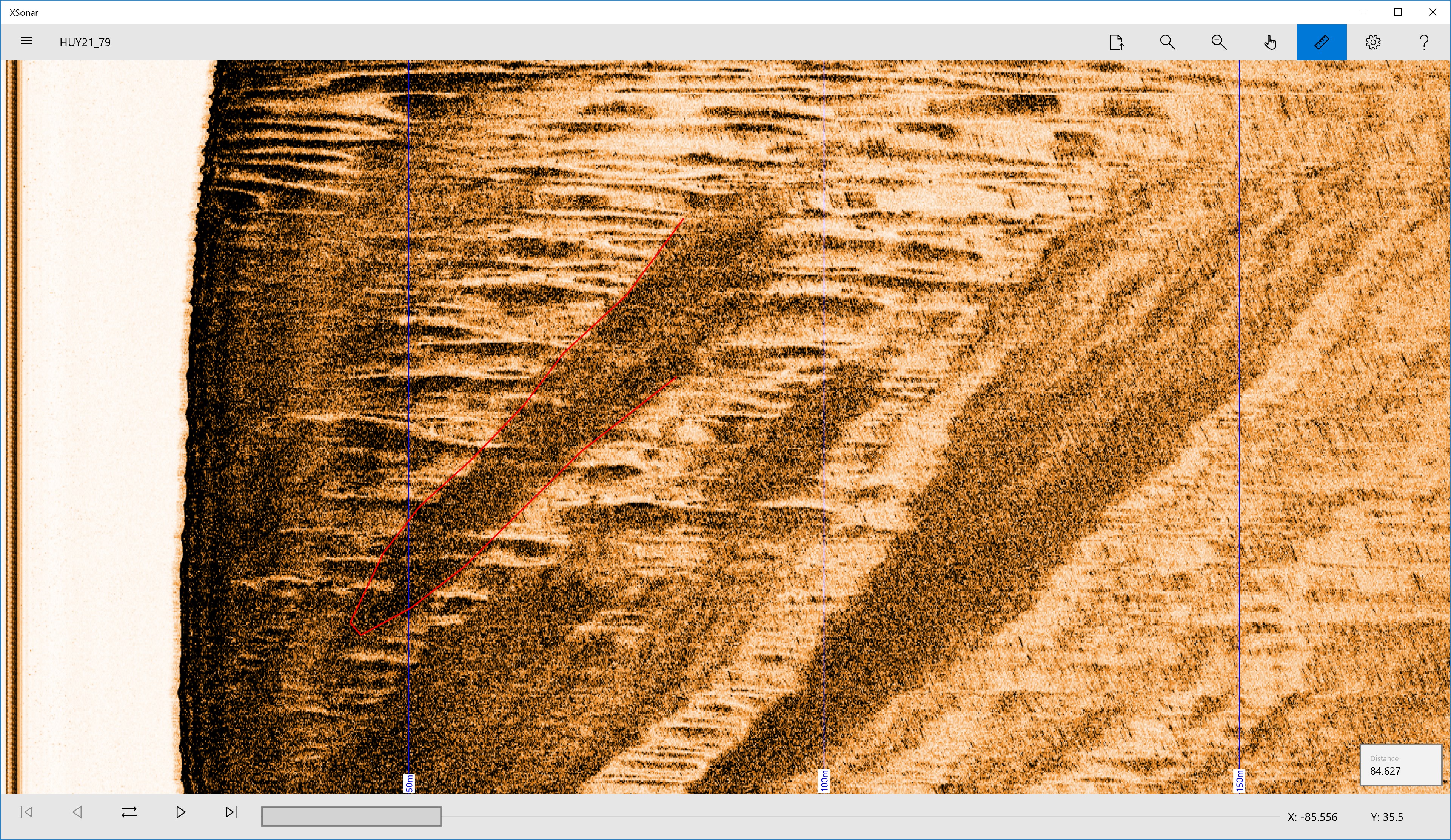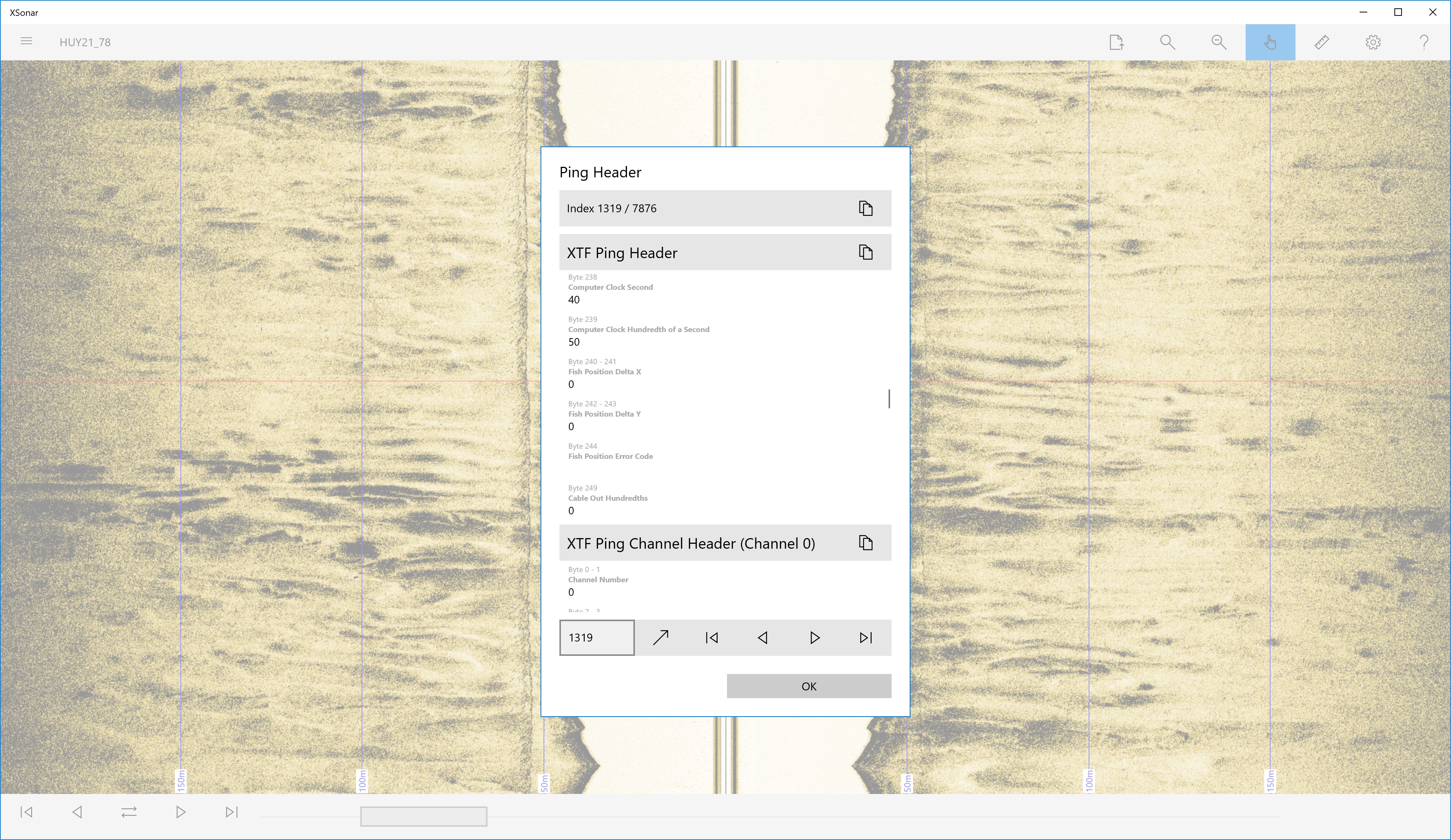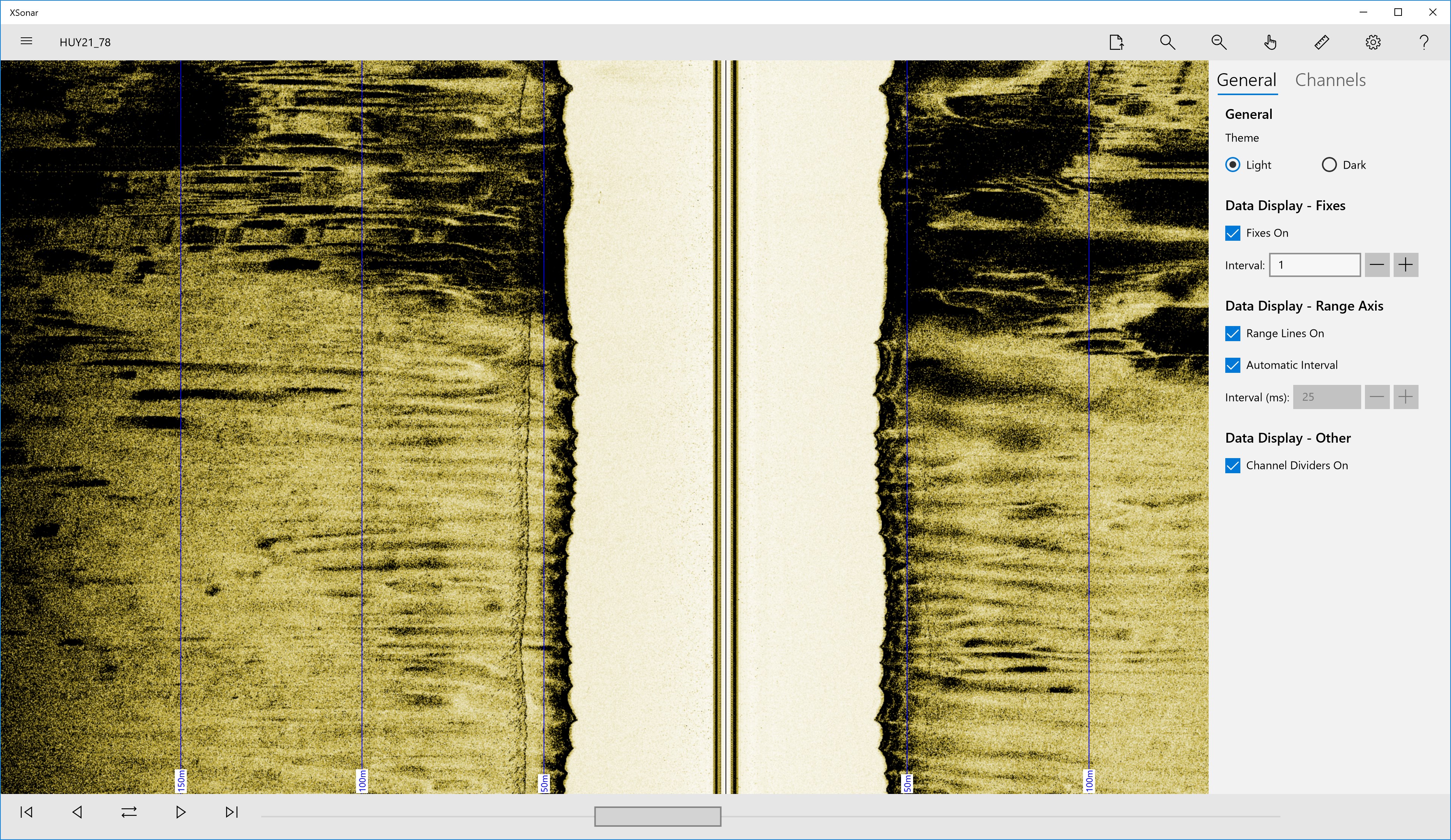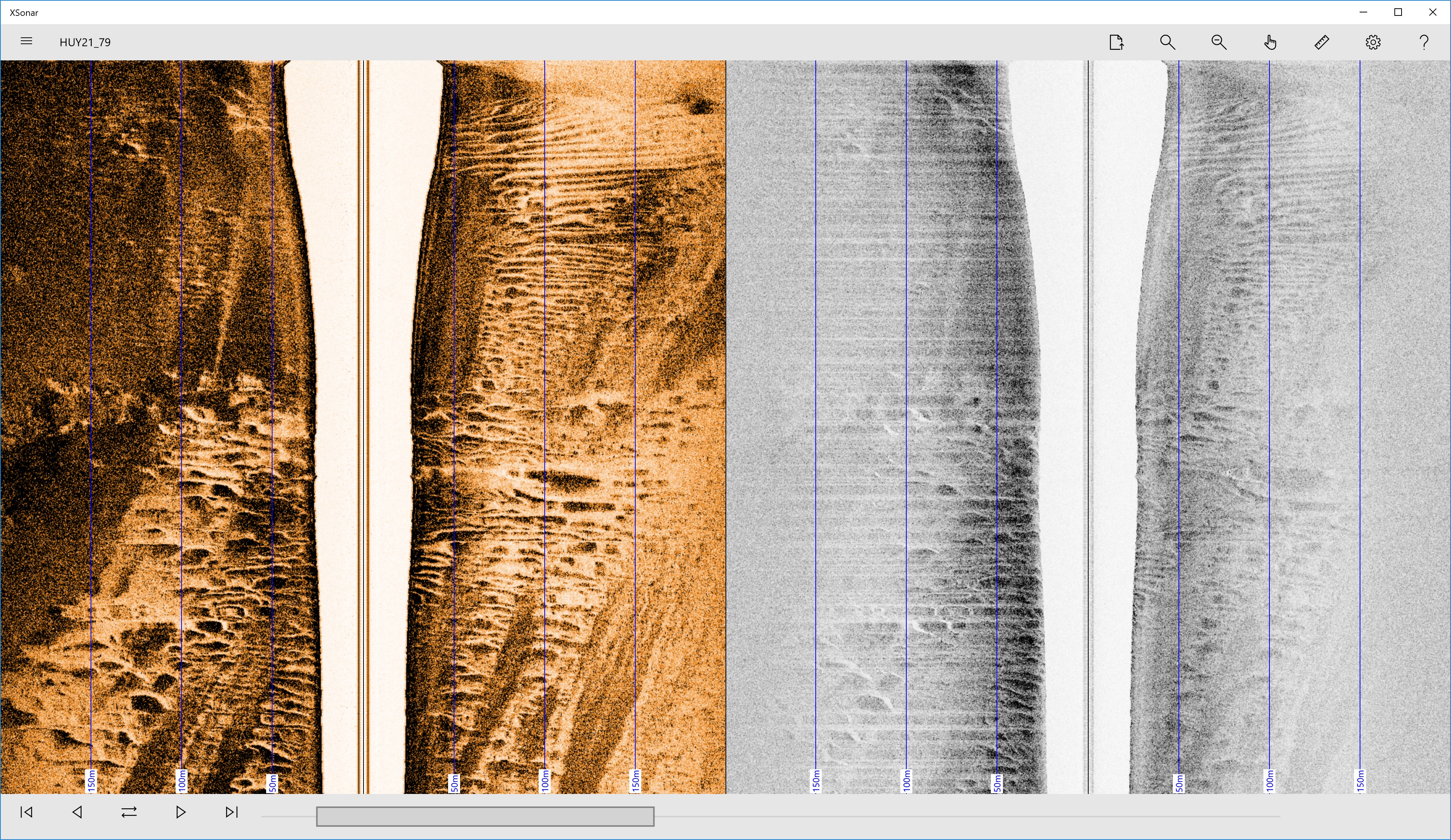 Open JSF and XTF filesView headers and summary information (start time, end time, number of pings) for each filePan, zoom and flip the dataAnnotate the data with fixes and range lines (at configurable intervals)Create a colour bar to display the data in your preferred style. Each channel can have a different colour bar if required, or all can share the same one.Density plot to aid optimal colour bar creationMeasurement toolCopy header data to the clipboardMap view - easily inspect the line track