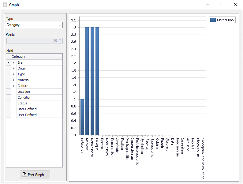 Sample fields include era, origin, type, material, culture, location, condition, status, barcode, manufacturer, date received, cost, value, year, serial number, artist, quantity and appraiser.Very easy to learn and use.Online help file.Numerous user defined fields so you can setup the software to suit your exact needs.Number and Date reports showing upcoming reminders.Rich text format notes areas for customer details and notes.30 Customizable feature tracking check boxes.Dealer name and contact information tracking area.Rich text format notes areas for each record.Advanced multi-level nested item categorization system.Quick and Easy Data Entry with Customizable Pull Down Menus.Powerful Data Sorting and Filtering.Simple and easy cut, copy, insert and record navigation functions.Multiple Image Support (up to 100 pictures for each record !). All major image types are supported (i.e. bmp, jpg, gif, png etc.).Easily incorporate pictures from your Digital Camera or Scanner. Also attach and view PDF equipment manual files in Image area.Full color image reports.Powerful and Intuitive Search Functions that let you quickly and easily retrieve the data you need Comma delimited data import.Multiple Data Views Including Spreadsheet, Album View (allowing you to visually view different items in your inventory side by side) and 3-dimensional full color Graphs showing inventory breakdown.Data export features allowing you to transfer data to spreadsheets or other software programs.