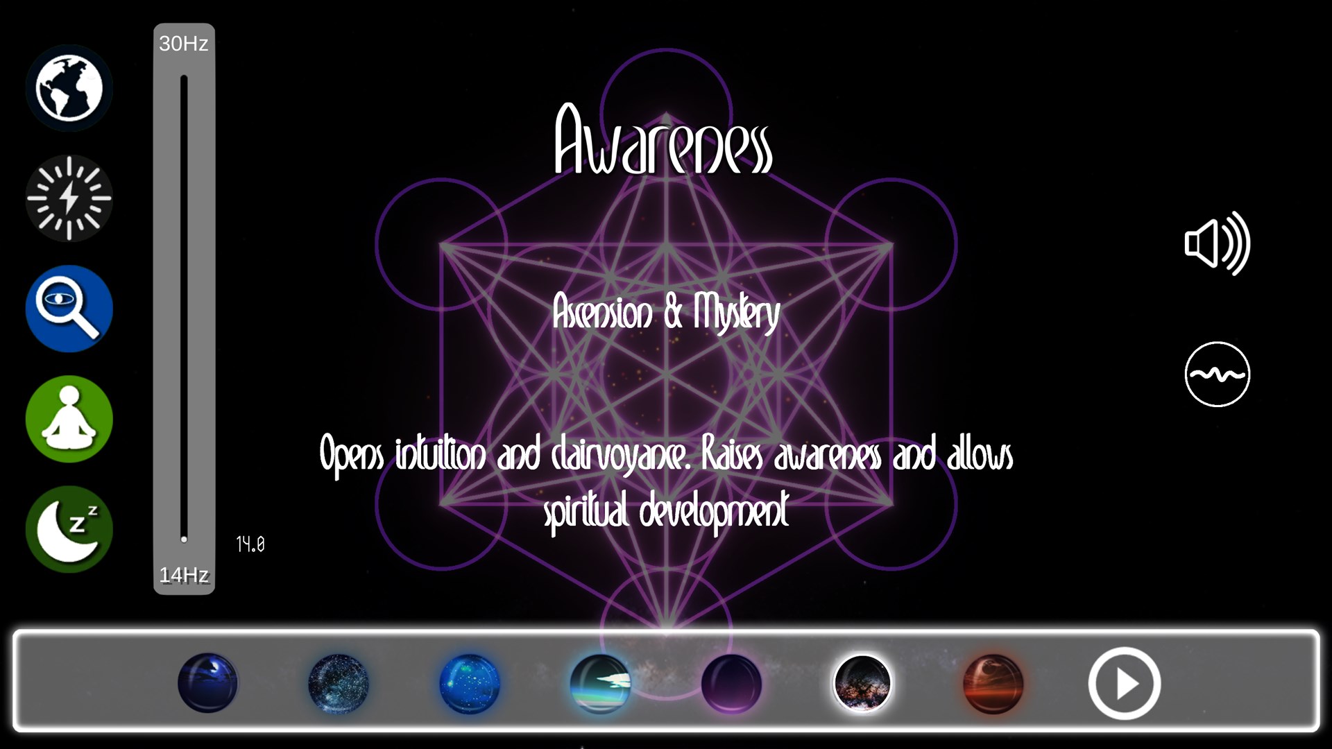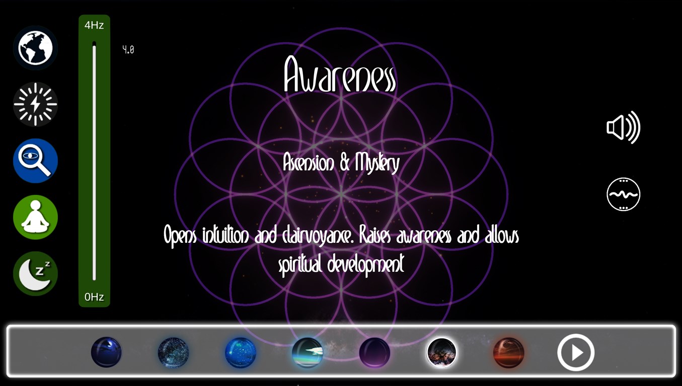 Sacred Geometry Meditation will enhance your meditation experience by providing access to ancient shapes for contemplation along with Solfeggio Frequencies played with Binaural Beats. It provides you with adjustable tones, waves & musical scale that relaxes, heals and transforms.