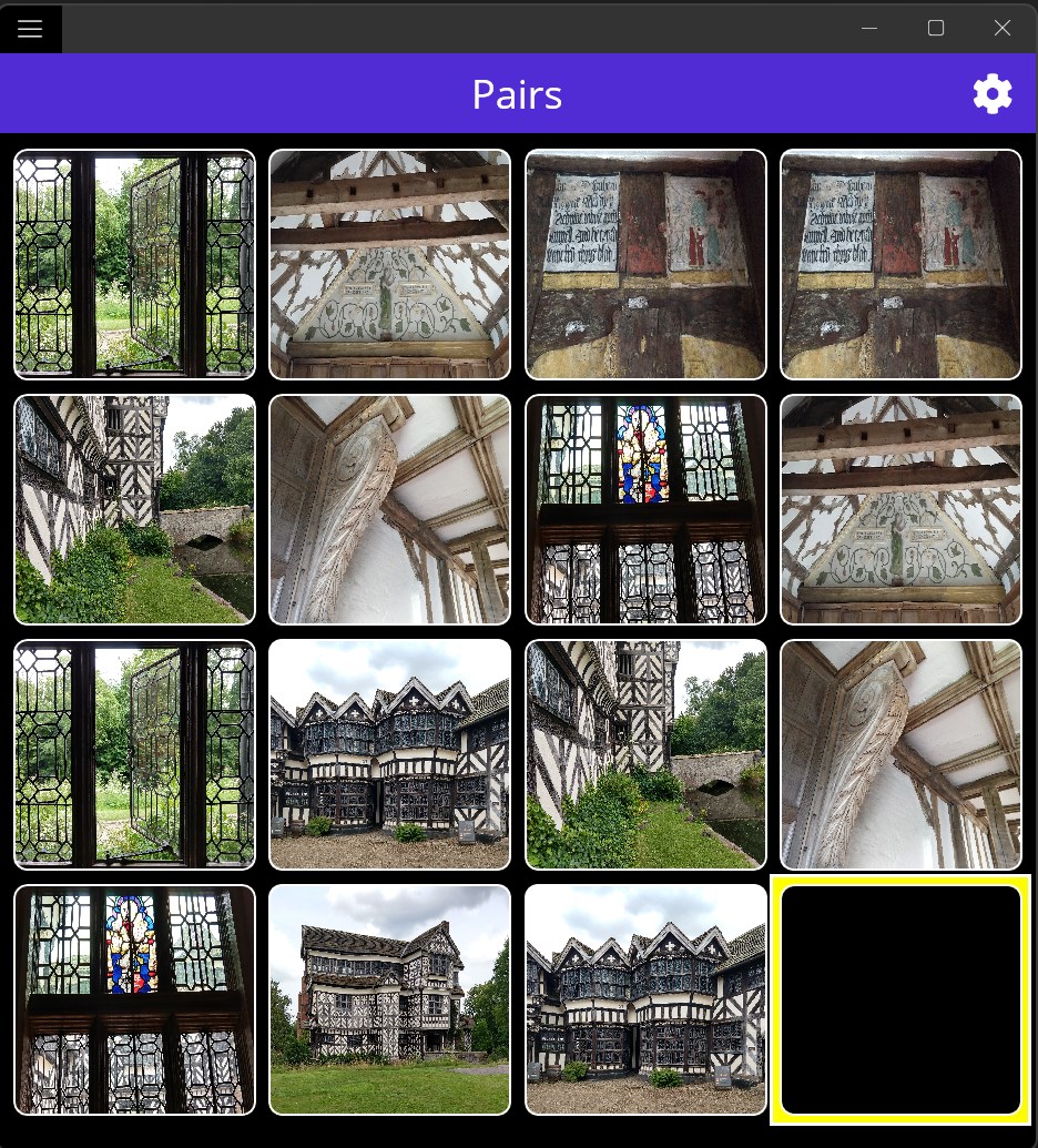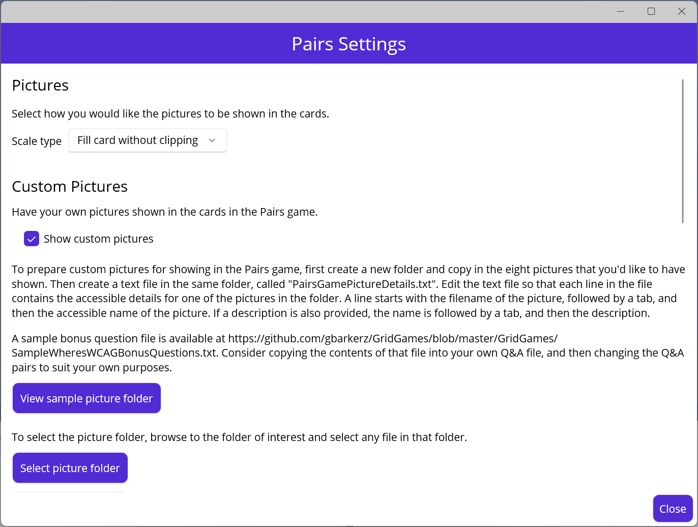 To have your own pictures shown in the Pairs game, along with custom accessible names and descriptions, please follow the steps described in the Pairs Settings page.