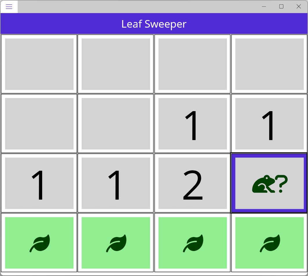 The Leaf Sweeper Game is based on the traditional Minesweeper game, but the aim of this game is to sweep the leaves off a group of paving stones without disturbing two frogs resting under the leaves on two of the stones. When the game is run, a 4-by-4 grid of squares appears, with each square showing a leaf symbol. The squares represent a group of paving stones covered with leaves. First clear the leaves off one of the stones by clicking on the stone. When using a keyboard, move focus to the grid of squares and arrow around to move to the stone of interest, and then press Space or Enter to clear the leaves off the stone. When the leaves are cleared, the number of frogs in the stones adjacent to that stone will be shown on the stone. If no frogs are on adjacent stones, then the clicked stone shows nothing. In addition, all adjacent stones with no frogs will also be cleared until blocked by stones with one or more stones showing nearby frog counts.