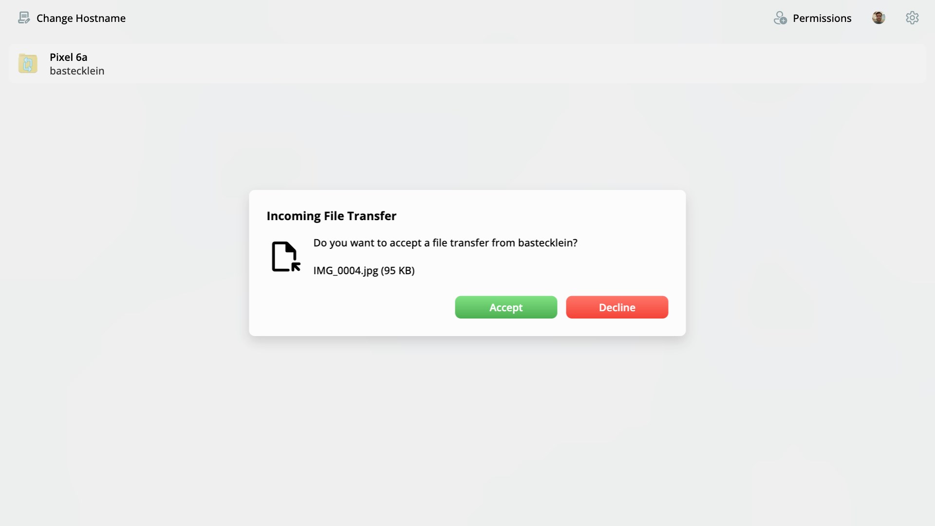 Cross-Platform - Works on all your devicesPeer to Peer - Connect directly between your devices, files are never sent to a third party serverSimple - App is straight forward and easy to usePermissions Support - Allow other users to connect to your device, great for sharing files between family and friends