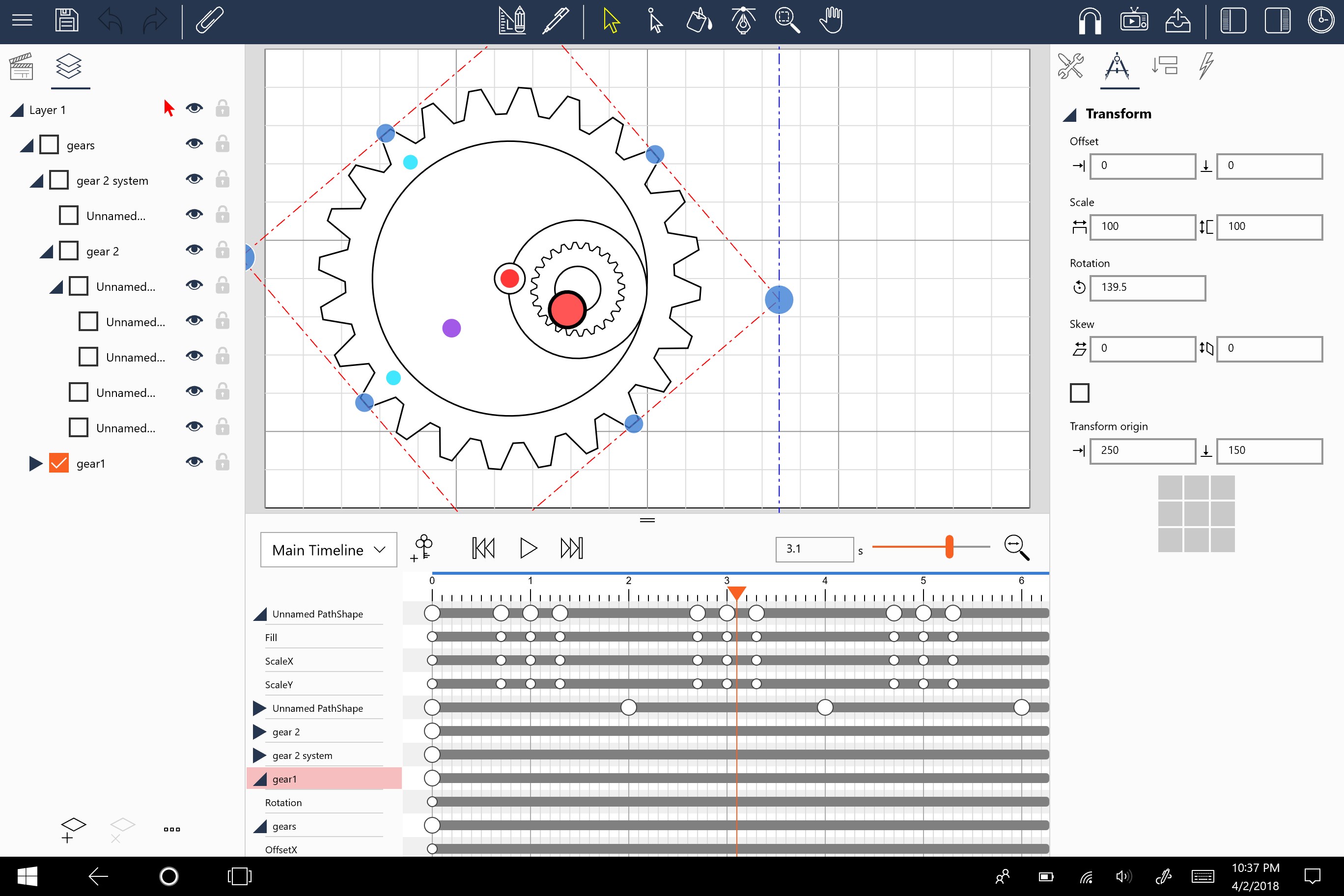 • Timeline view with precise control over every key frame. Easing and timing can be specified independently for each property (including transform components: X, Y, Scale, Rotation, Skew)