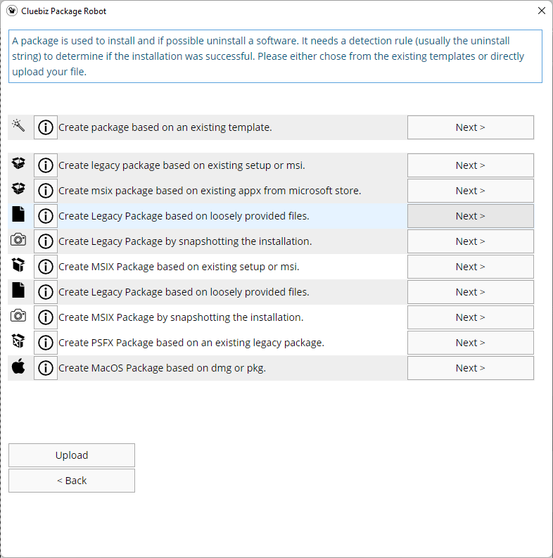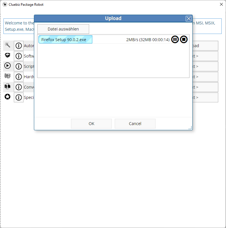 With Package Robot and its wizard support, you can create software packages for software distribution in your company without being a specialist. Simply upload the installation file for the application to be packaged to our package creation server.