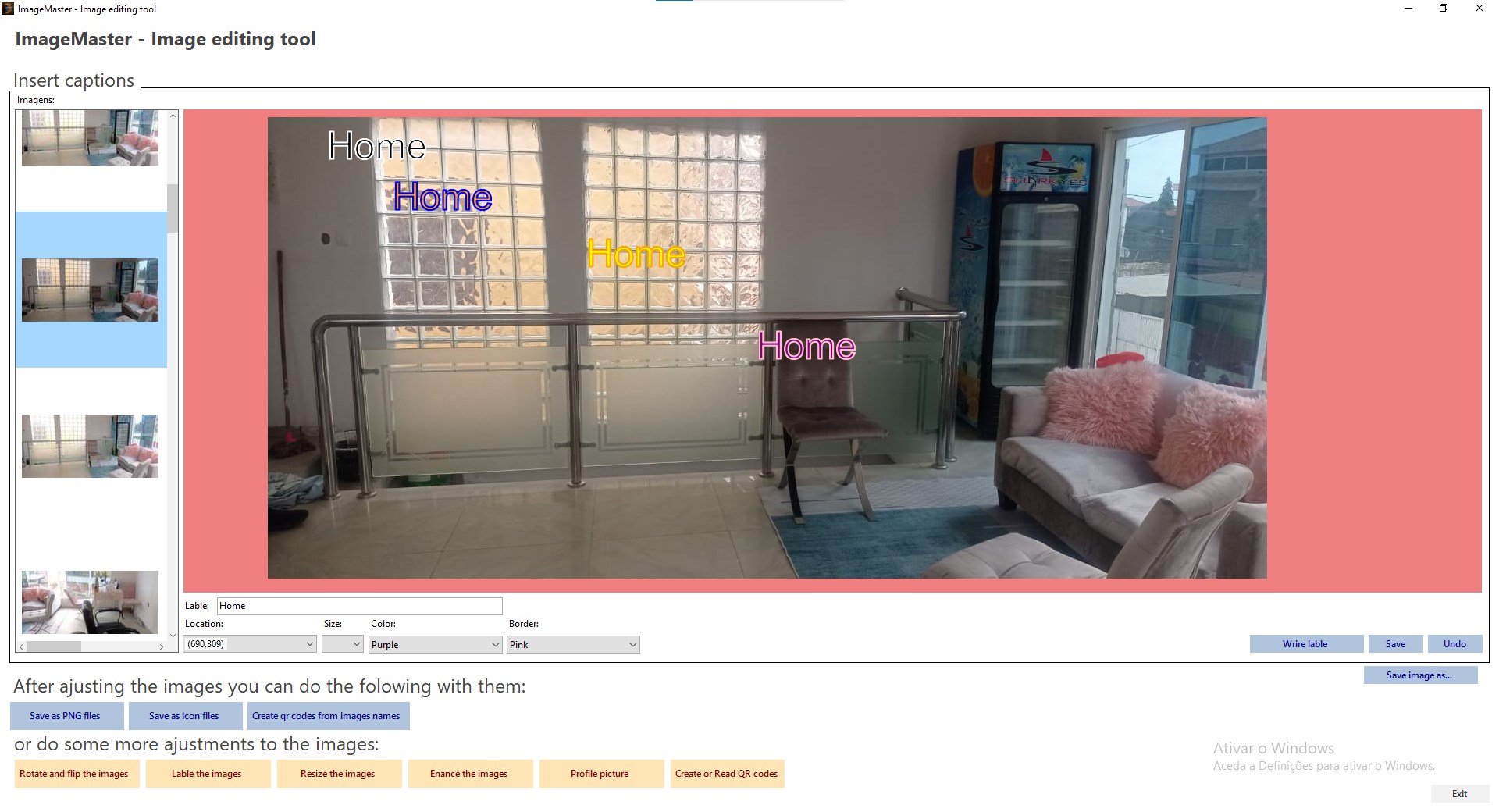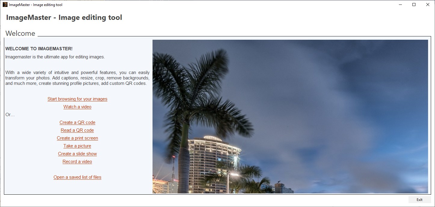 Select and open multiple image files and videos (jpg, jpeg, png, bmp, mp4, webm")Lable and resize imagesCreate profile picturesConvert to PNG or icon files Save a list or collection of edited images for future useCreate a PowerPoint slide shows in secondsCreate print screens Take pictures and record videos with the PC webcamRead and create QR codes