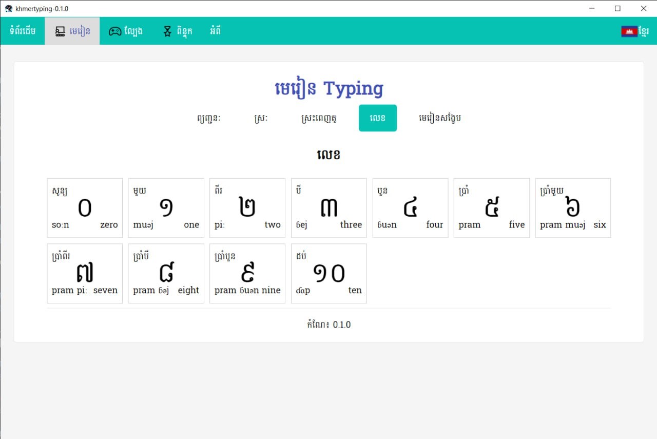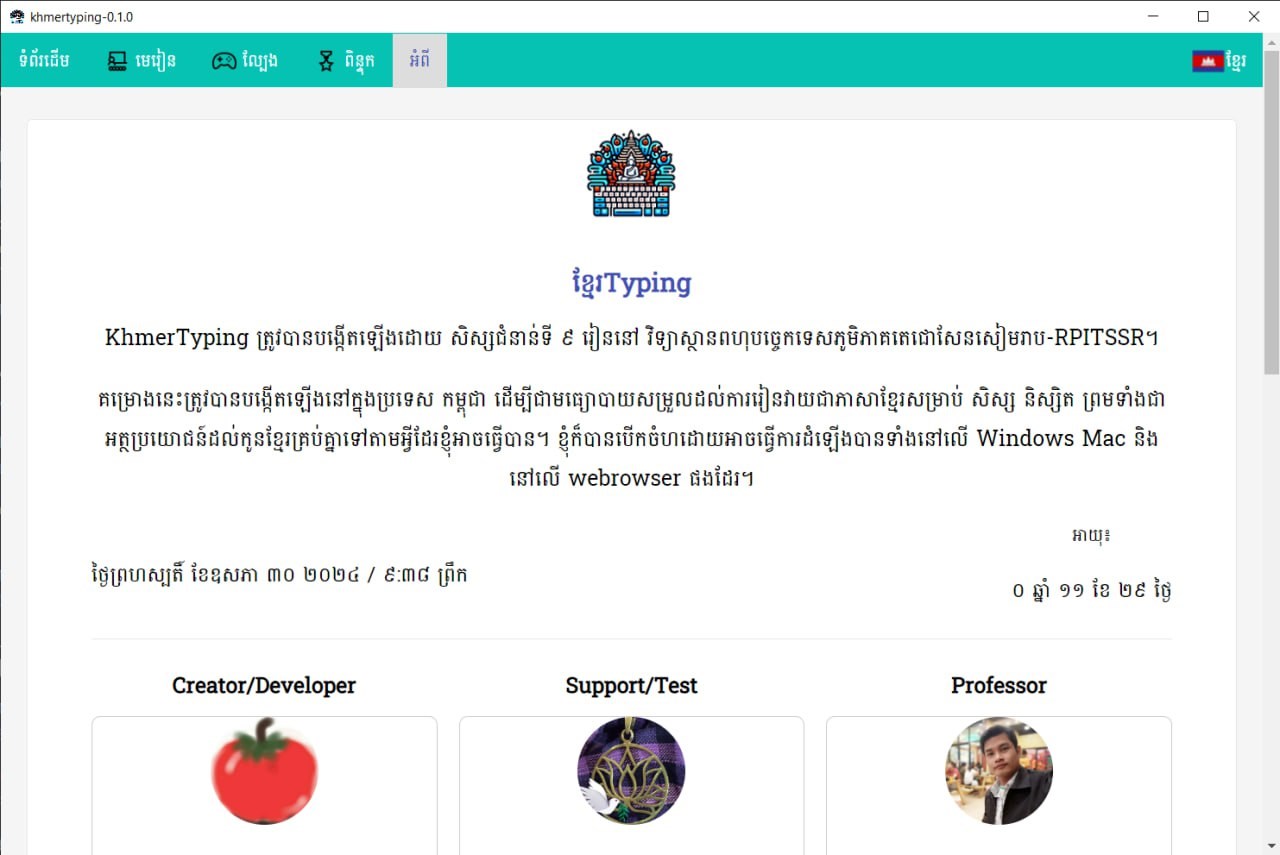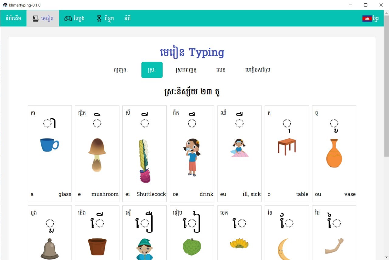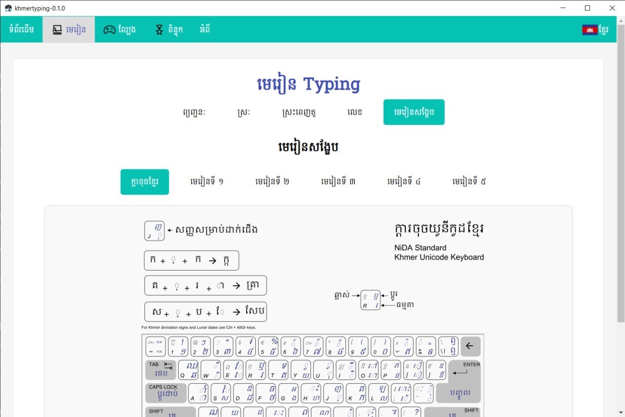 This project was created in Cambodia to be a means of facilitating learning to type in Khmer for students, as well as boys and girls who are starting to learn to type Khmer characters for the first time throughout Cambodia and to promote the Khmer script, its use and learning to write Khmer characters more. It will be beneficial to all Khmer children according to what they can do and share. And you