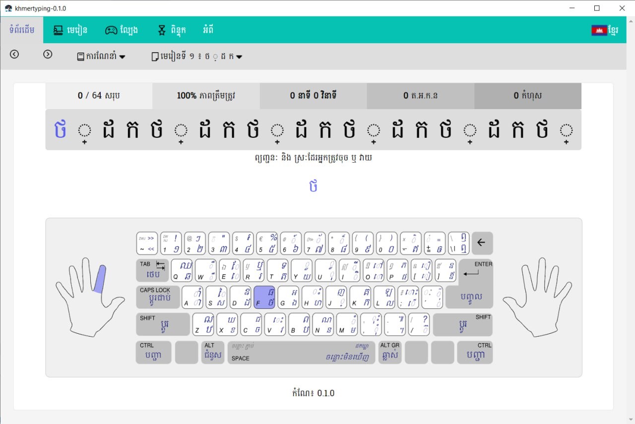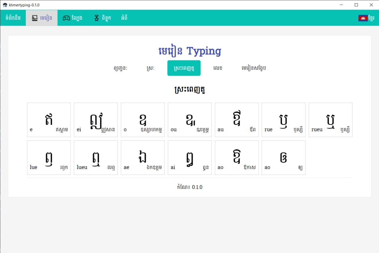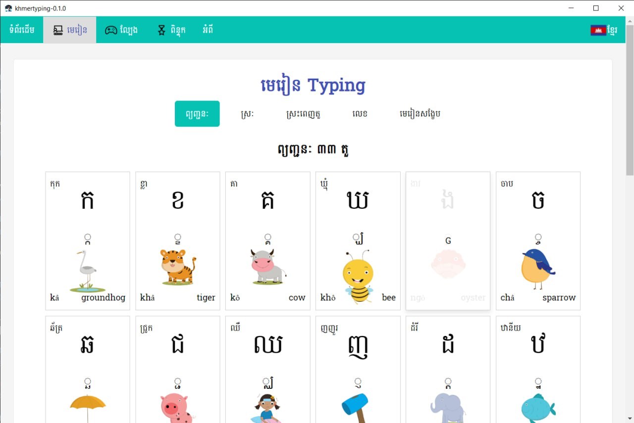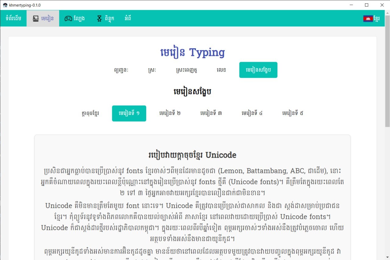 This project was created in Cambodia to be a means of facilitating learning to type in Khmer for students, as well as boys and girls who are starting to learn to type Khmer characters for the first time throughout Cambodia and to promote the Khmer script, its use and learning to write Khmer characters more. It will be beneficial to all Khmer children according to what they can do and share. And you