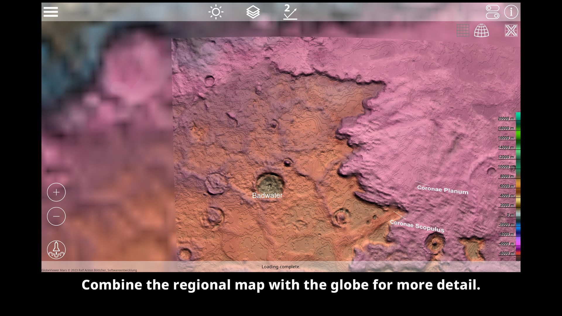 Since version 0.4 we show the landing region of NASA's Mars2020 mission. The extra high-resolution landing site map was generated using HiRISE data from the Mars Global Observer. Here you can see the rover's surroundings in Jezero Crater. In addition, you can enhance the heights in the 3D map to get an even better impression of the height gradients. The map shows the movements of the Perseverance rover and the Ingenuity helicopter, so you can follow the current mission progress on this map.