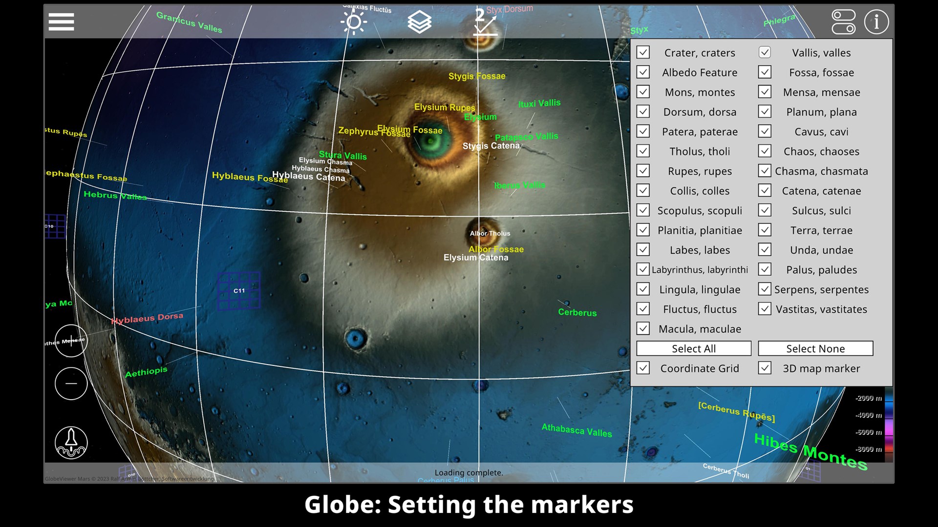 GlobeViewer Mars is an interactive and three-dimensional globe of the entire surface of Mars. The 3D global map shows all official designations for various surface features. If you are interested in a specific region, an even higher resolution local 3D map view can be loaded for a closer look at the craters, mountains and other formations. In addition, a mission log of all Mars missions since 1960 has been included.