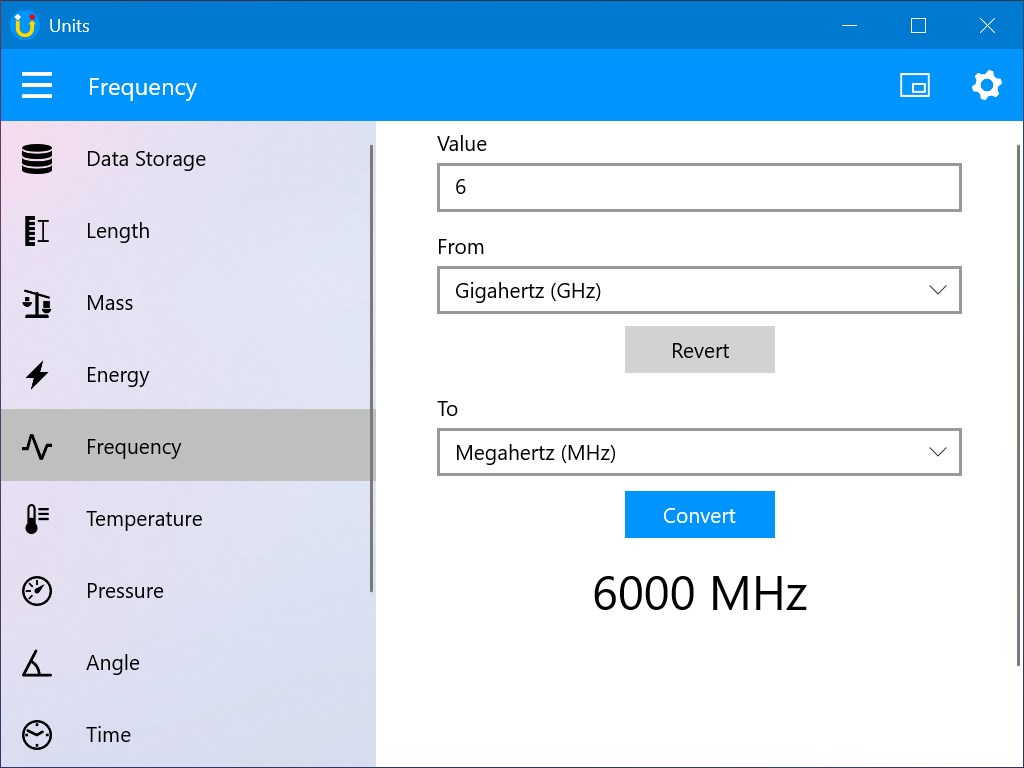 Convert units of measurement fast and easy. Units offers you many categories to choose from: Data Storage, Length, Mass, Energy, Frequency, Temperature, Pressure, Angle, Time, Speed, Volume, Area.