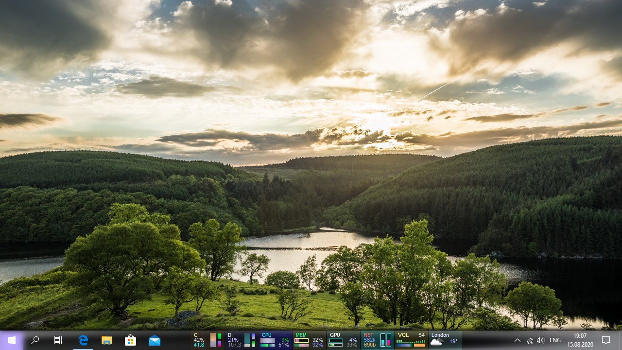 Makes the taskbar transparent, translucent, with a monochrome or tri-color gradient, with Aero Glass or Fluent Acrylic effect, shadow or backlighting, and sets the color for the buttons of docked and running applications. Over fifty predefined taskbar themes.