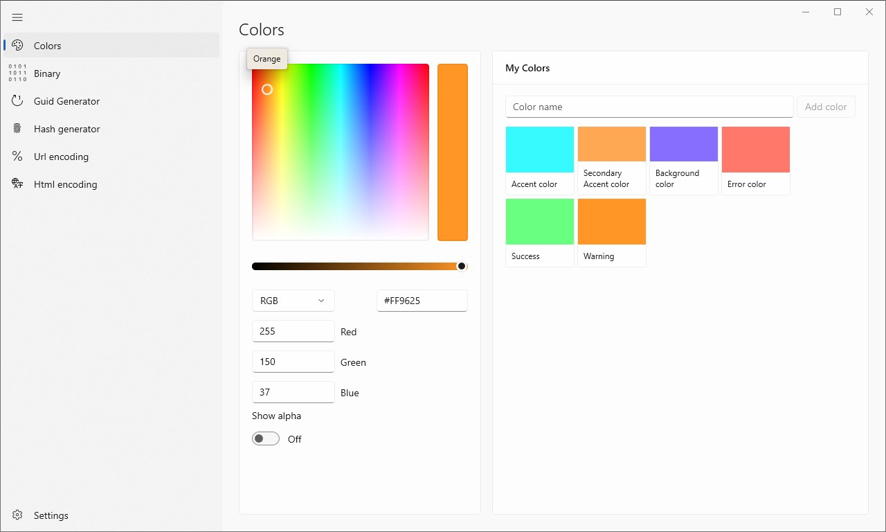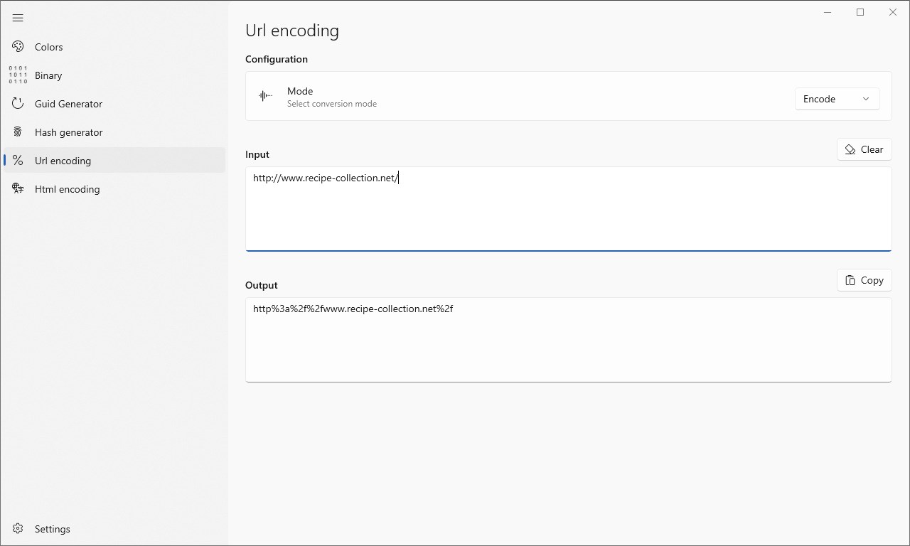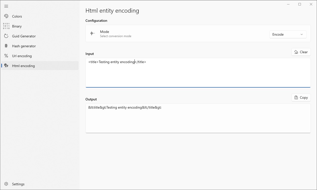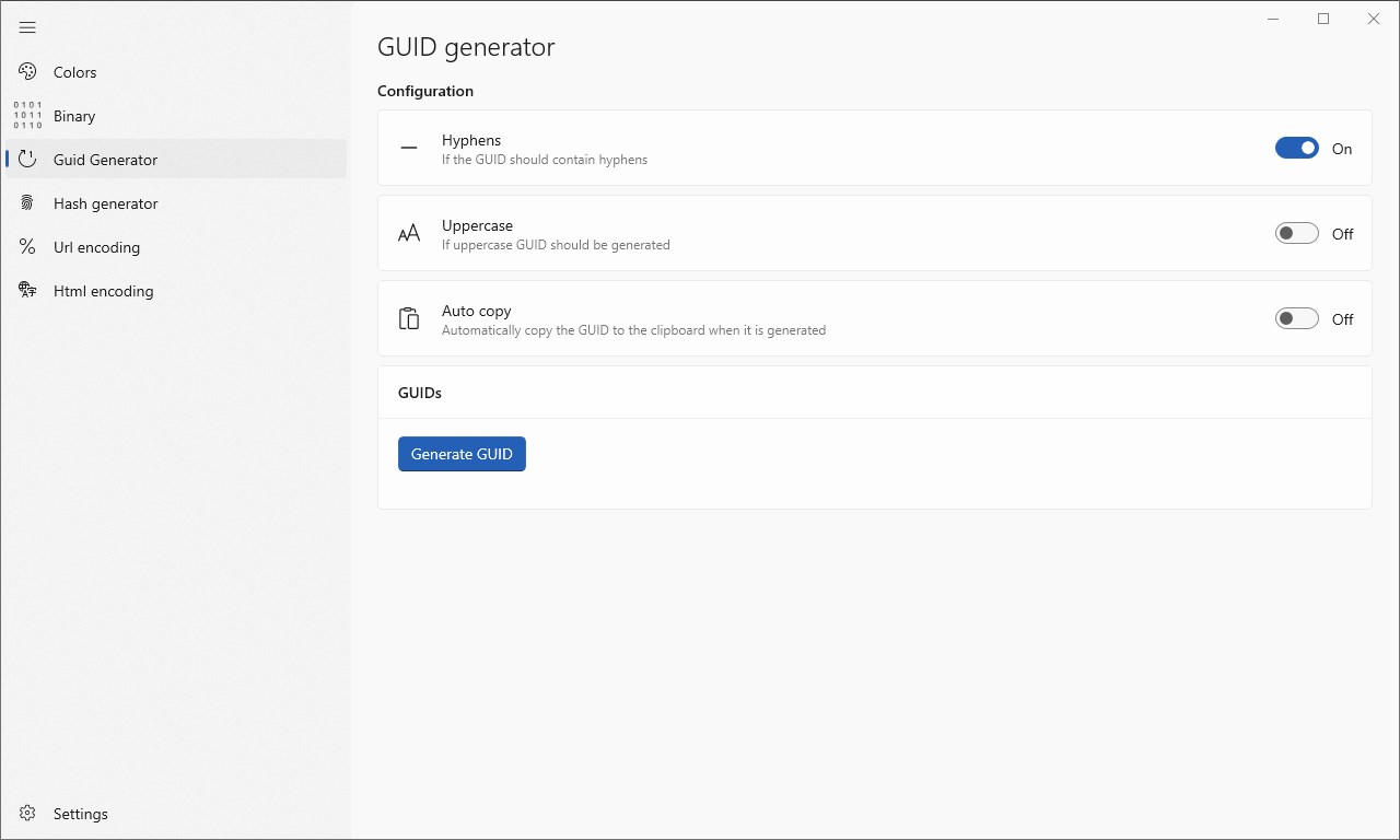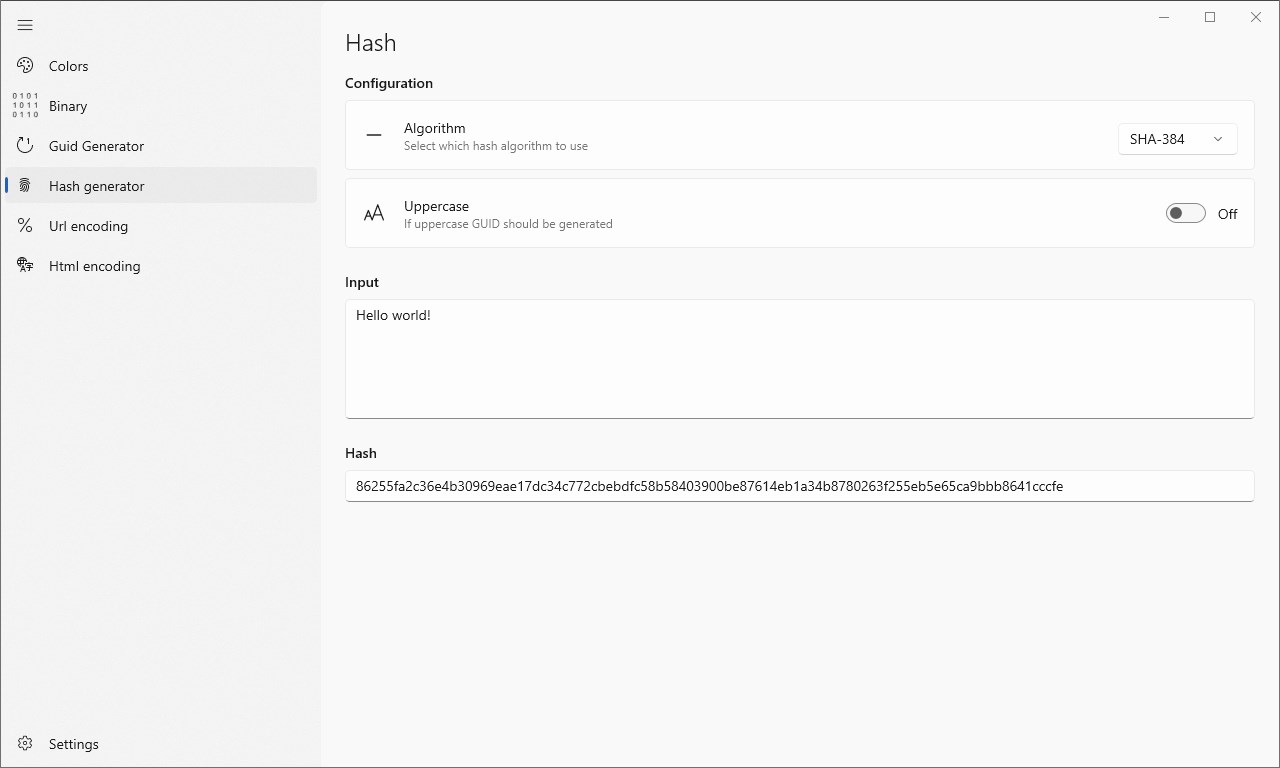Hexadecimal decoder (primitive types, little endian, big endian)GUID generatorHash generator (MD5, SHA-1, SHA-256, SHA-384, SHA-512)Color pickerColor collection (supports synching across your Windows devices)Base64 encoding and decodingUrl and HTML encoding and decoding