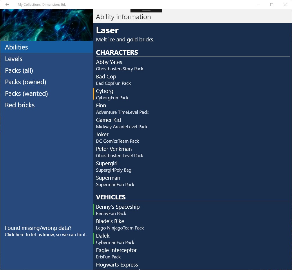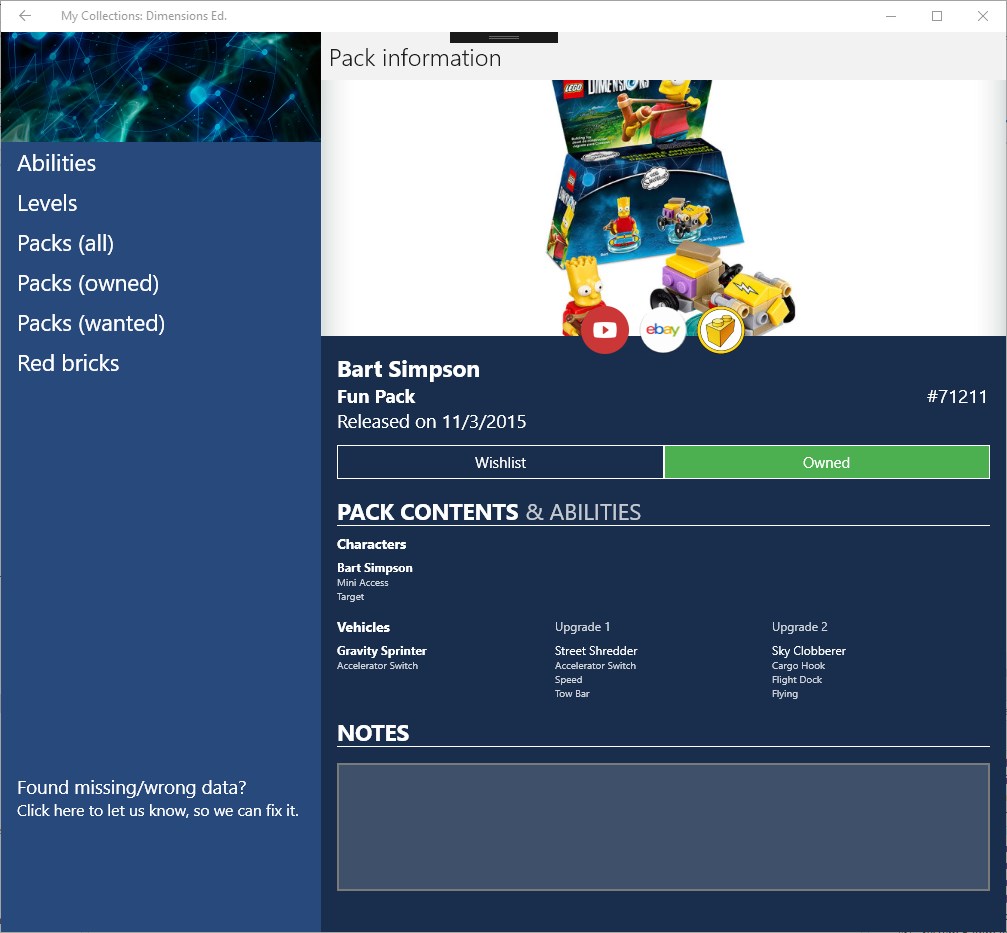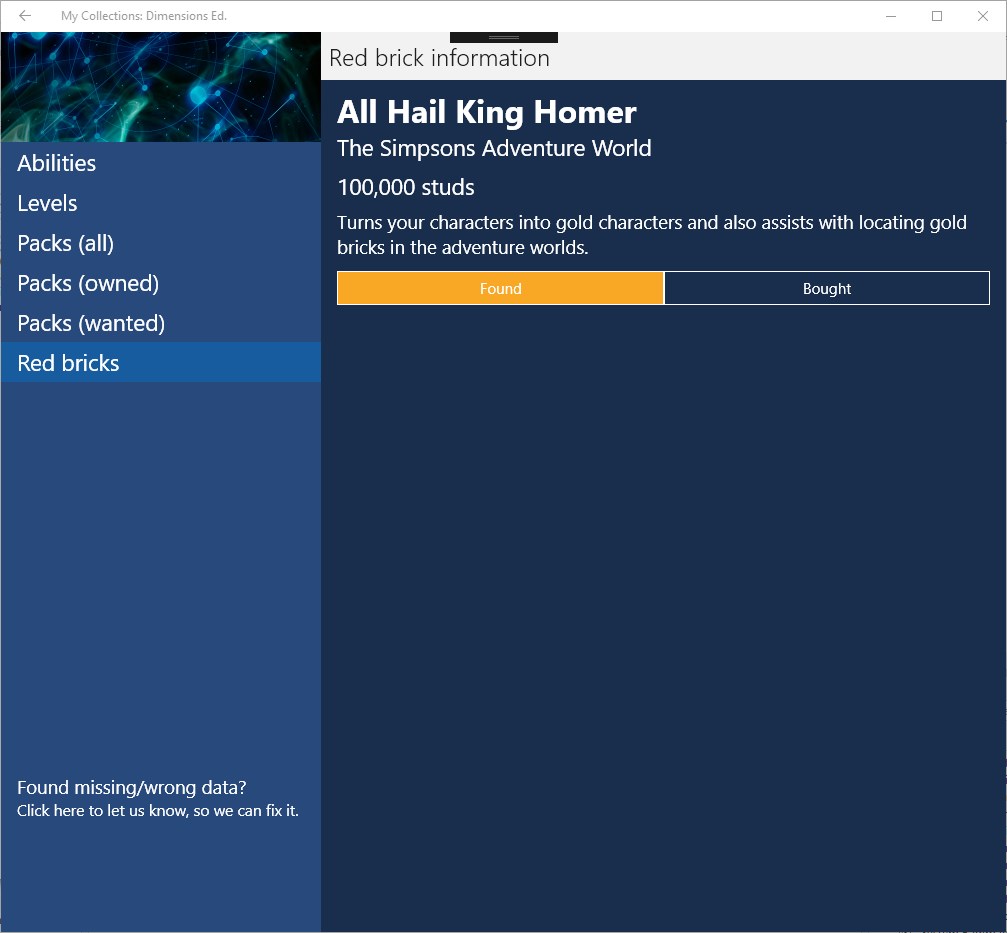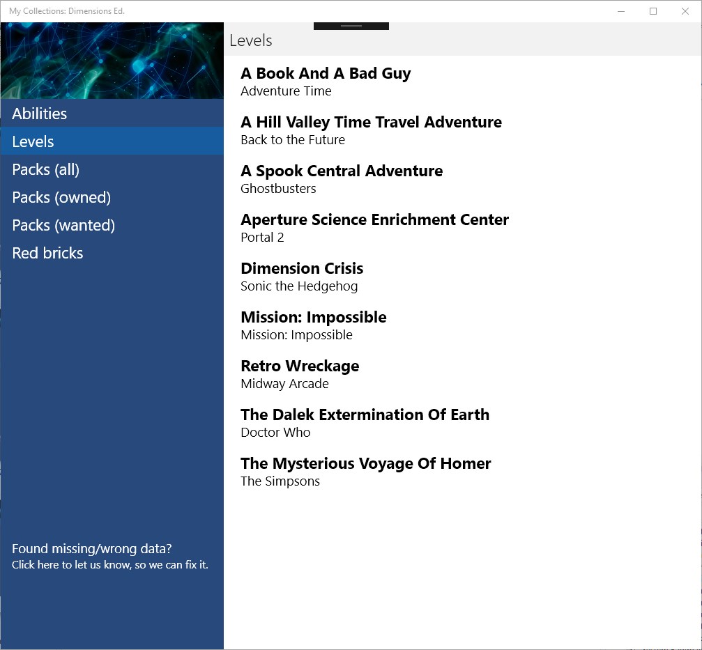 'My Collections: LEGO Dimensions Ed.' is an unofficial app and intended to be used for informational and educational purposes only. 'My Collections: Dimensions Ed.' is NOT licensed by, endorsed by, or associated with Warner Bros., Lego, or the makers of Lego Dimensions.