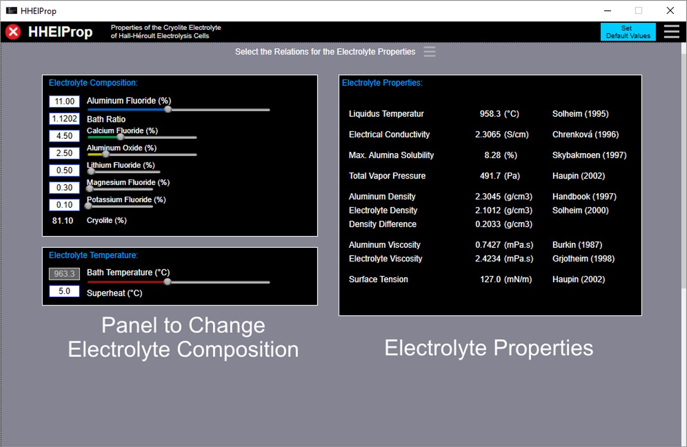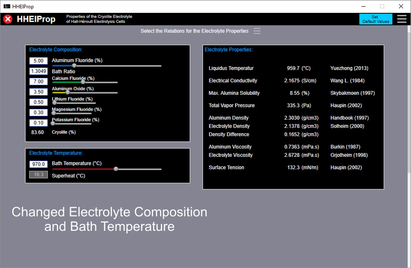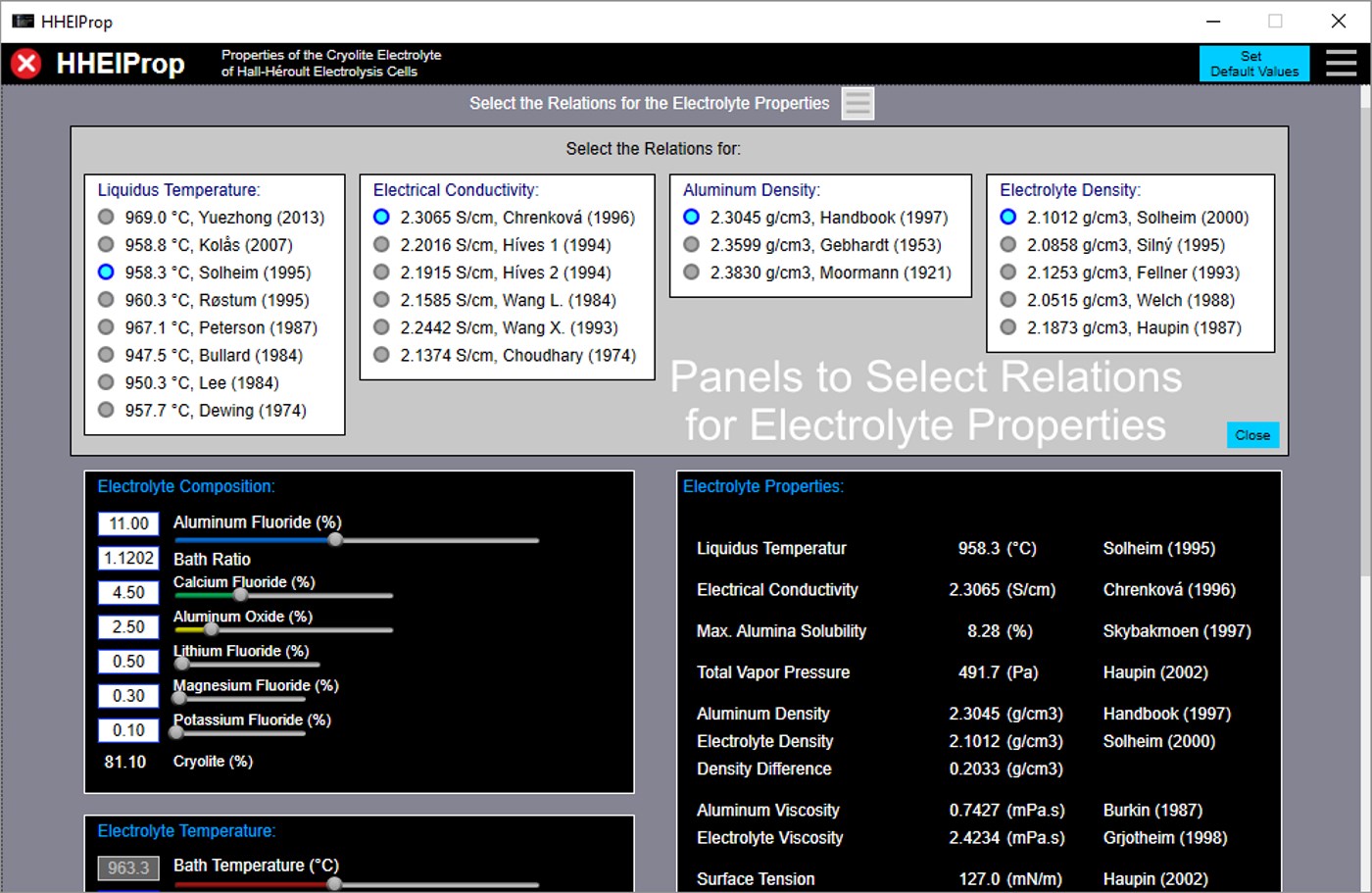 ElPropApp investigates the physical and chemical properties of the cryolite electrolyte for Hall-Héroult aluminum smelting electrolysis cells. This is done especially in view of the different relations for the electrolyte properties found in the literature.