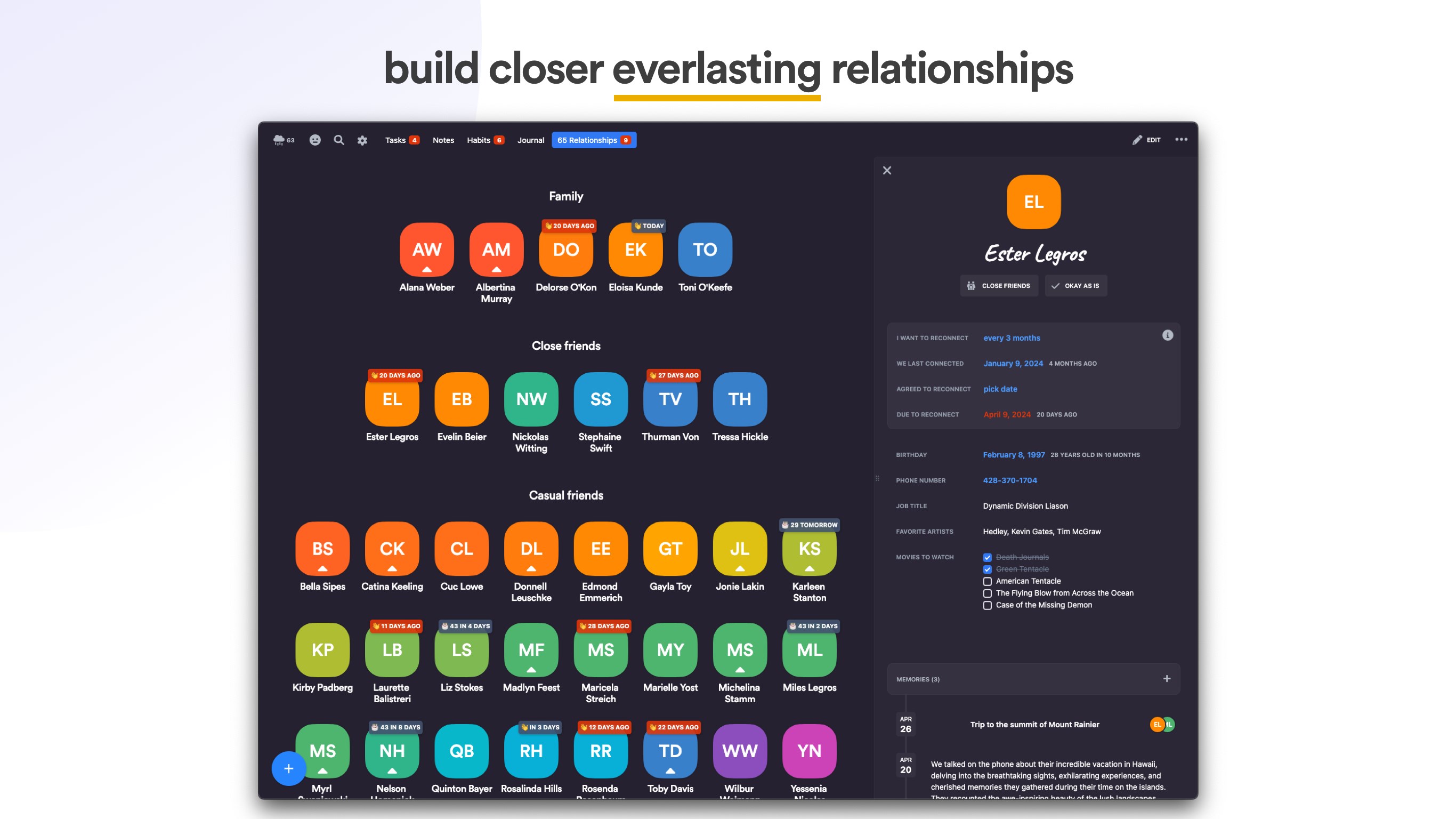 Lunatask 2 is here with Relationship Tracking, our take on a Personal CRM featuring fully customizable fields, beautiful hierarchy visualization, reconnect rules, and memories timeline with journal integration. Keep track of everything related to your friends and family, what to talk about next time you meet, and say goodbye to missed anniversaries forever.