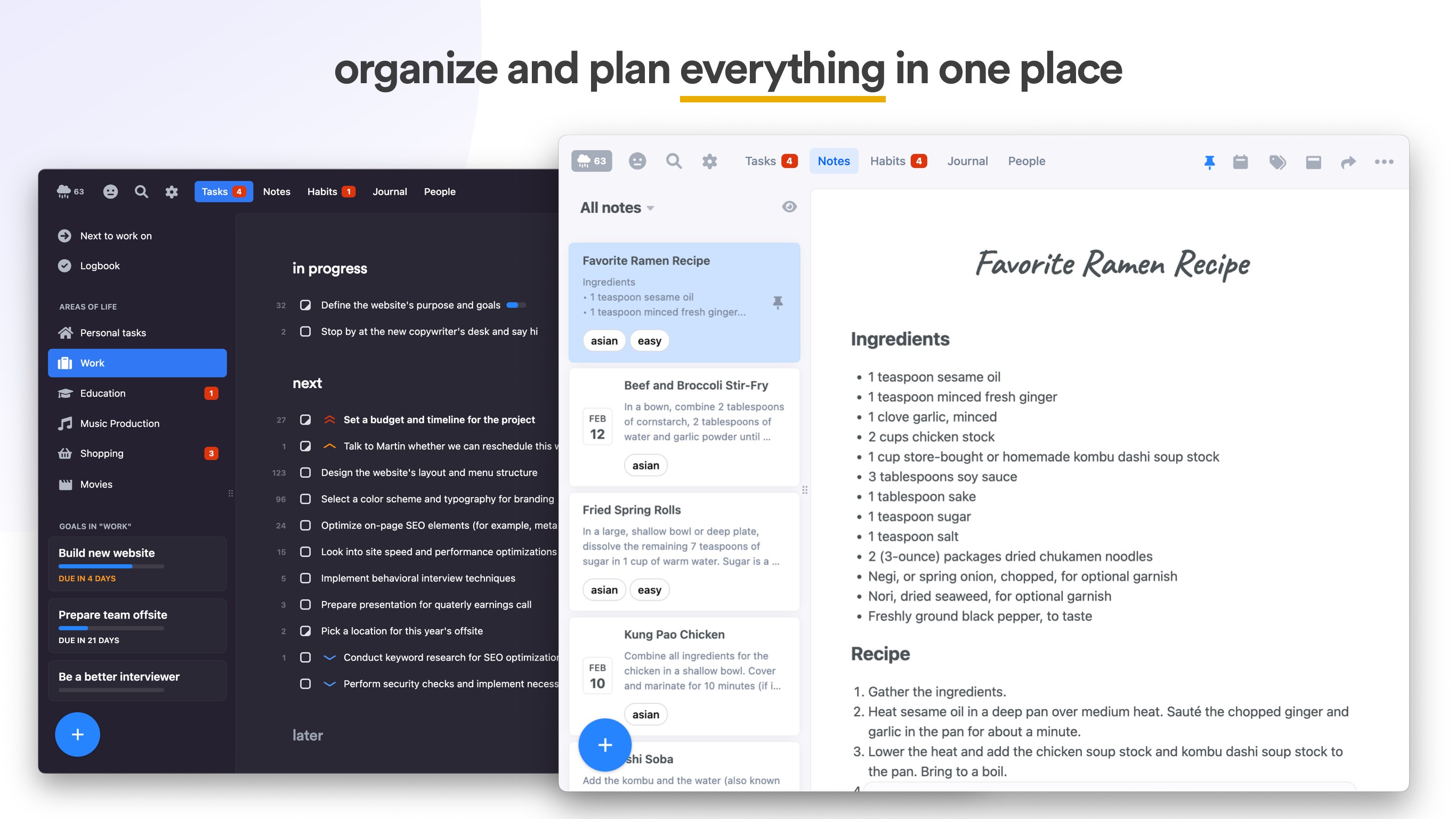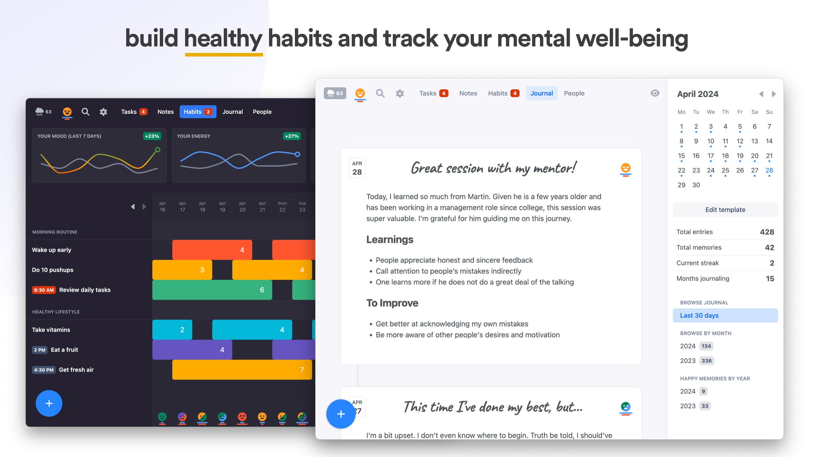 Our all-in-one approach allows us to integrate all the pieces together. Tasks with calendar, calendar with habits, or events with notes.
