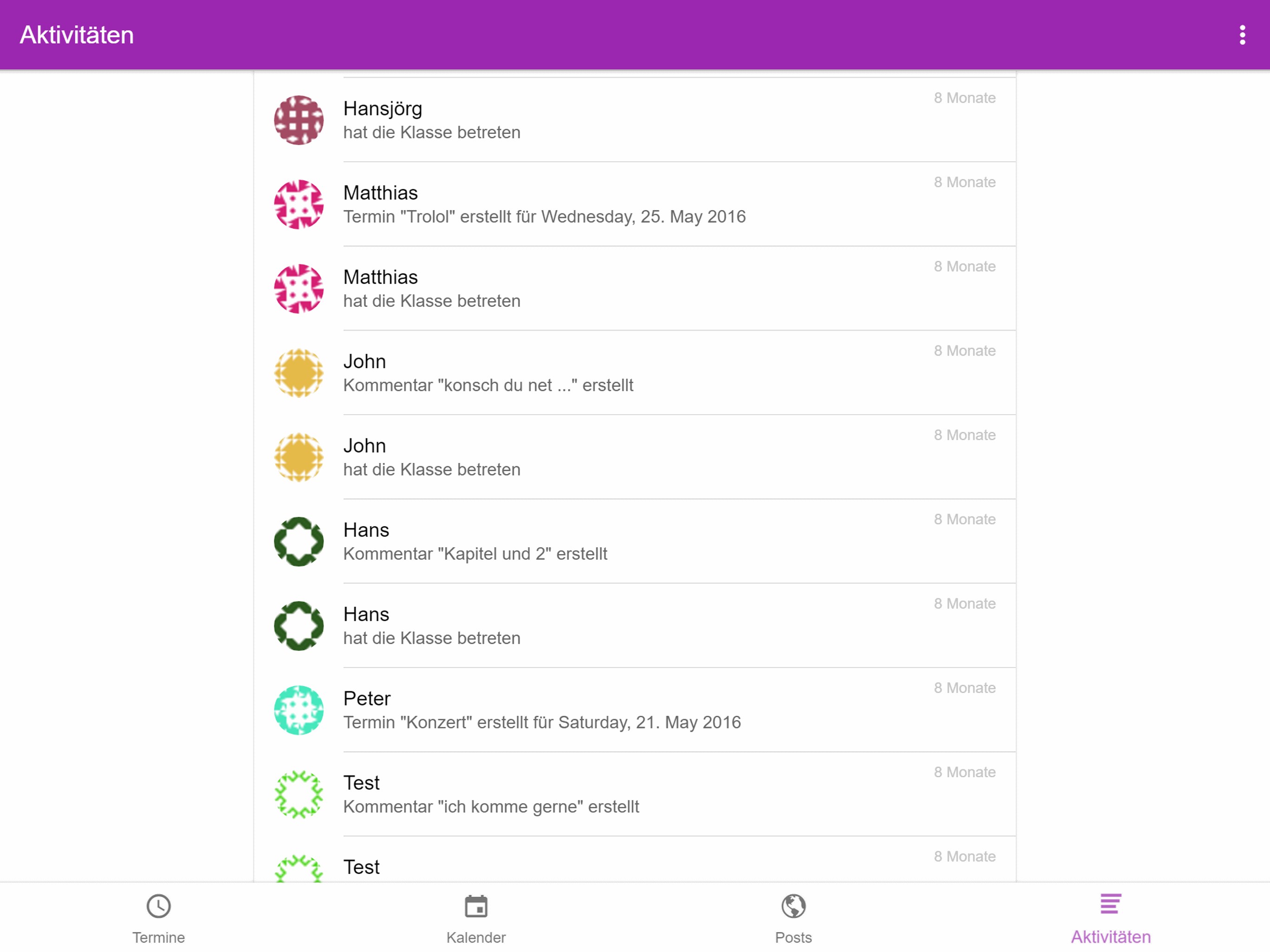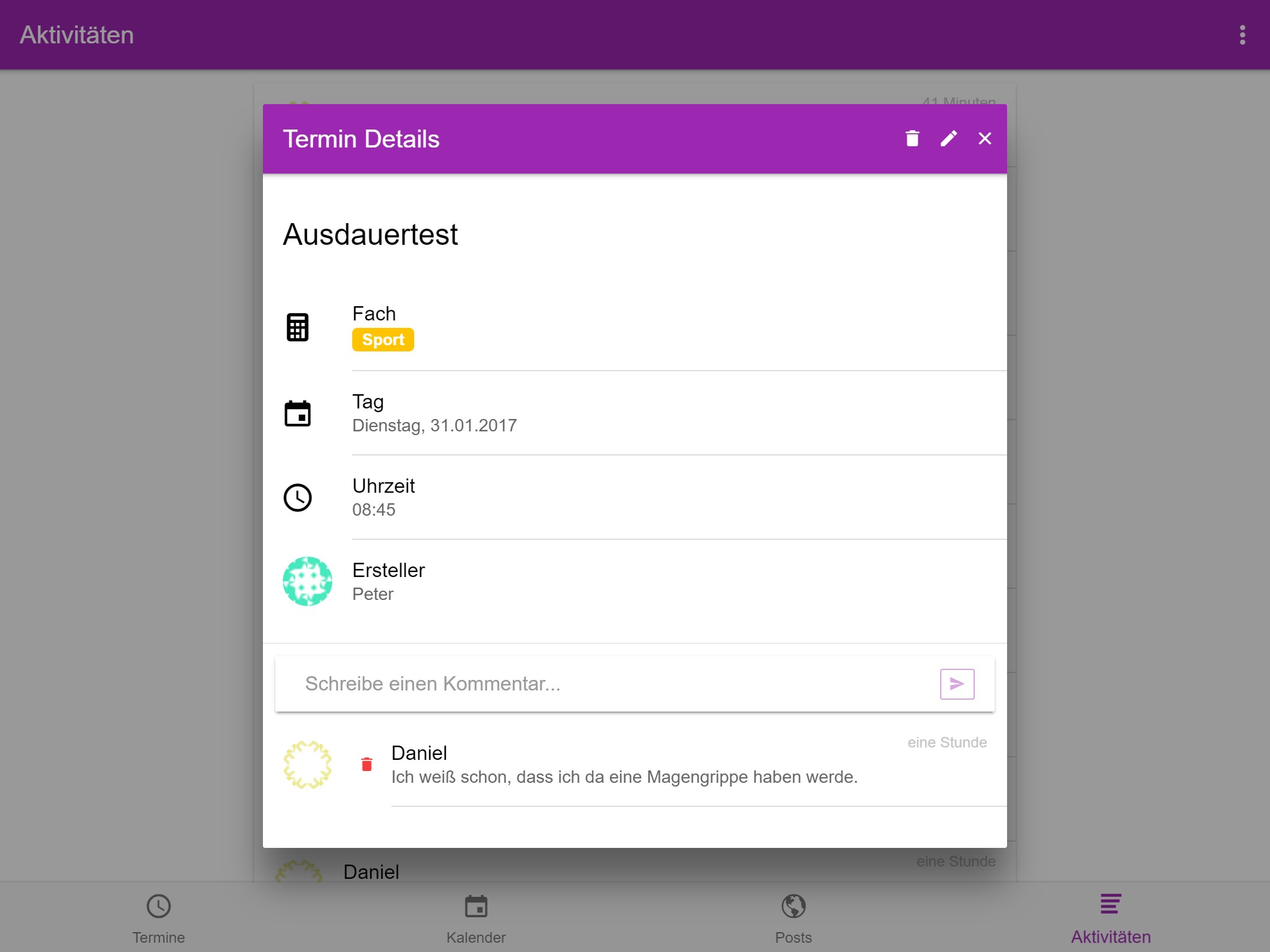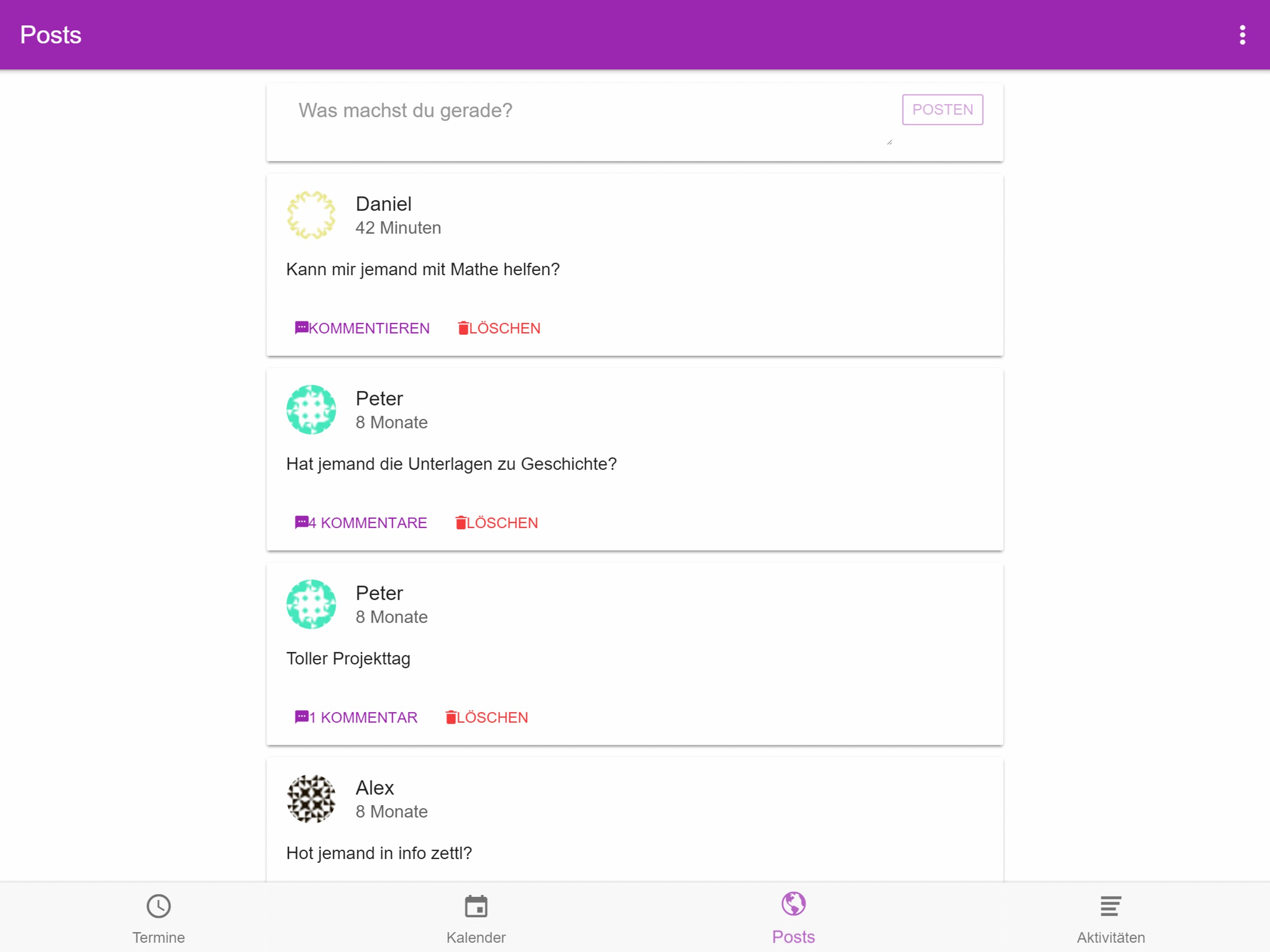 Shared Calendar, Events, Comments, Posts, Weekview, Dayview, Monthview, Invite Classmates