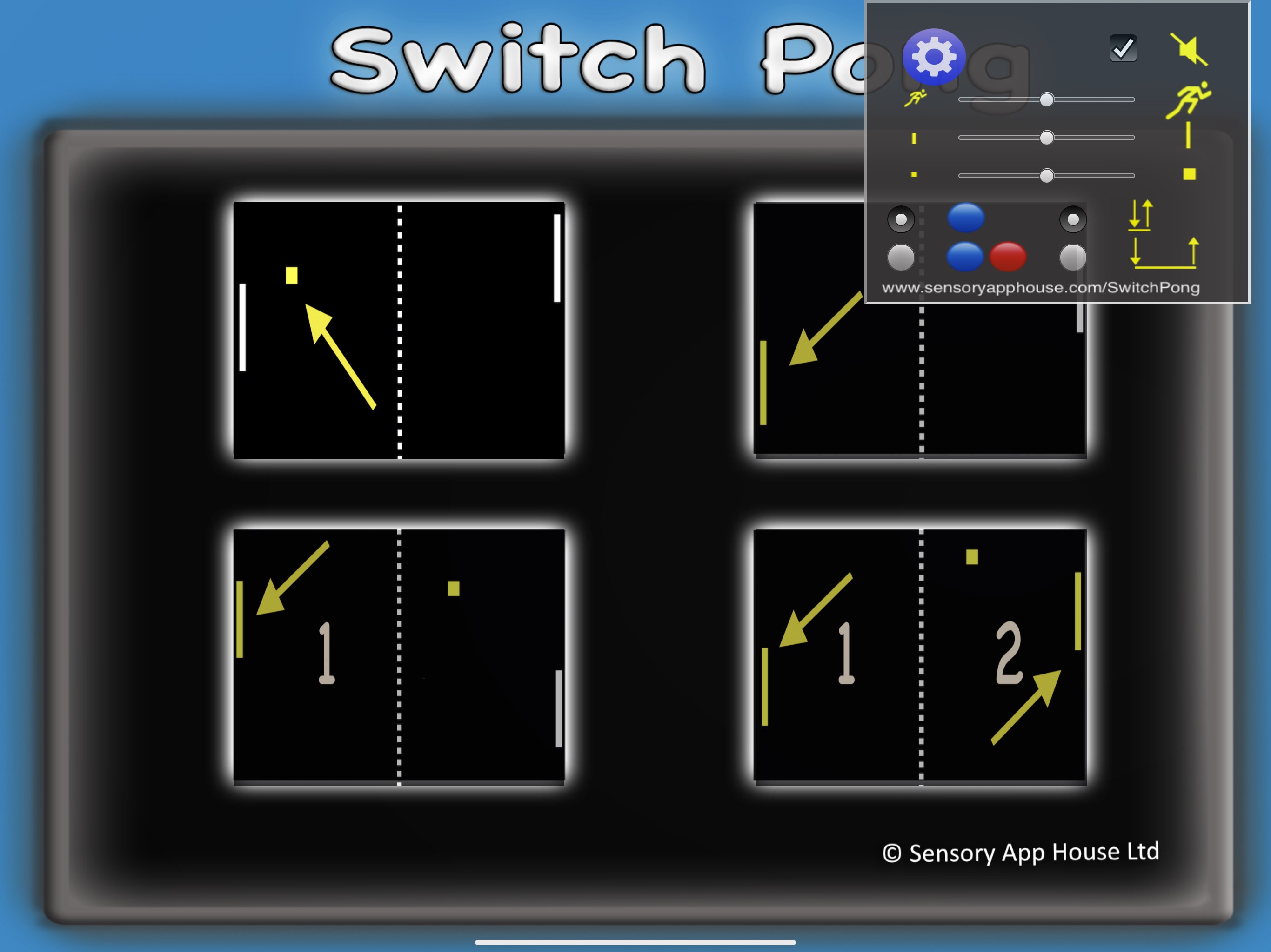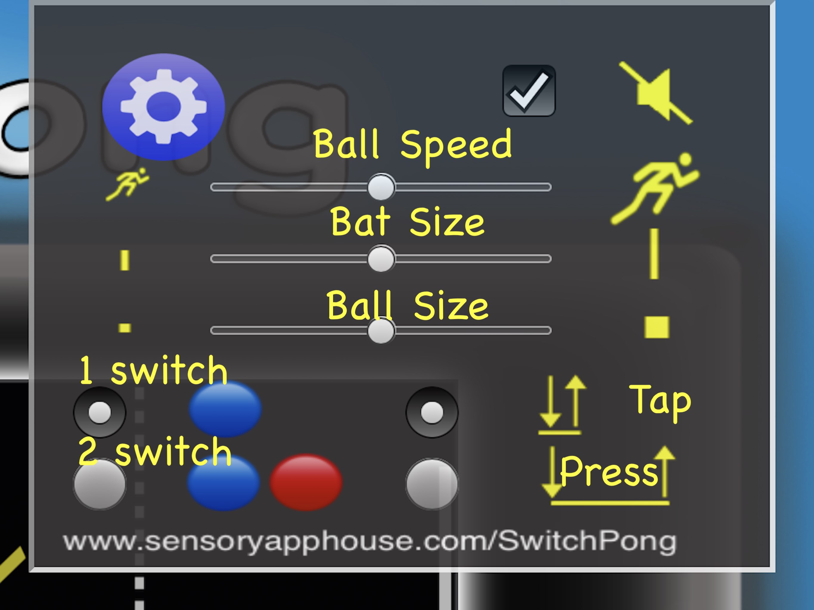 Switch Pong has settings for a single or two switches, and also settings for "Tap" to change paddle direction and “Press Hold” to move and stop the paddles.