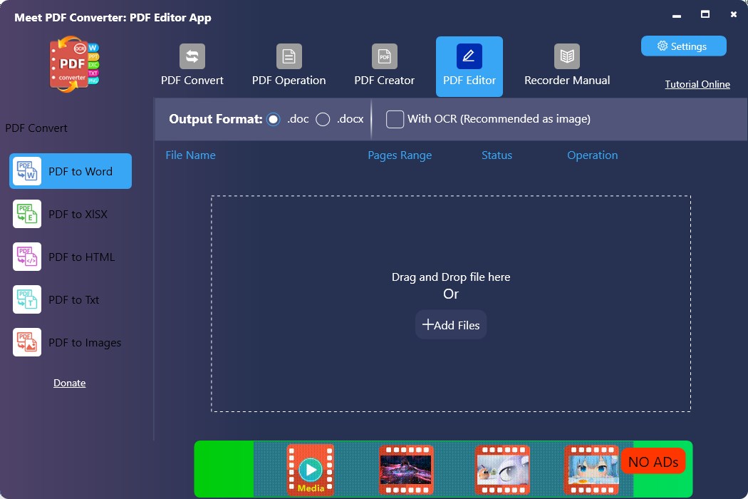 Meet PDF Converter is powerful, easy-use and full features pdf tool for you. The main features including PDF Converter, PDF Creator, PDF Operation and PDF Editor.